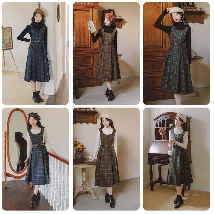 送料無料୨♥୧ イングランドスタイル秋ウィンターレディースドレス ネイビーカーキグリーン格子柄厚くするノースリーブヴィンテージミディ AOS38377488019