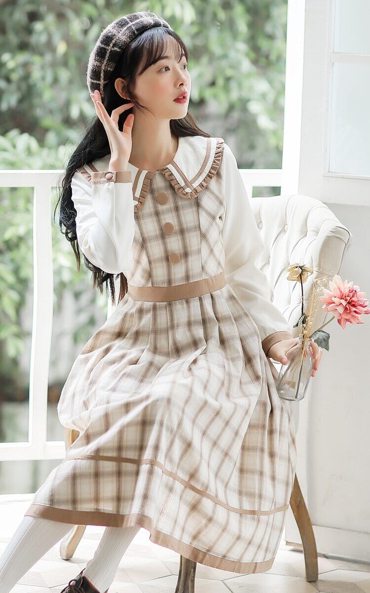 送料無料୨♥୧ スプリングオータムレディースドレス カラー格子柄長袖スリーブ ロング 大人ガーリー スウィート キュート カジュアル 春物 秋物 AOS9142283855