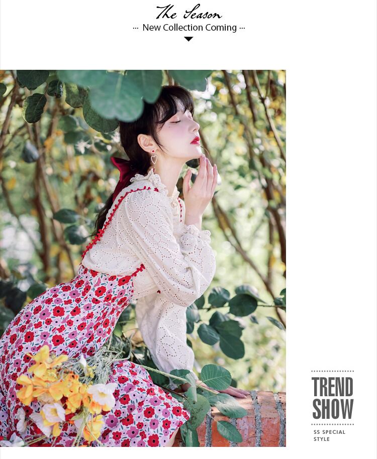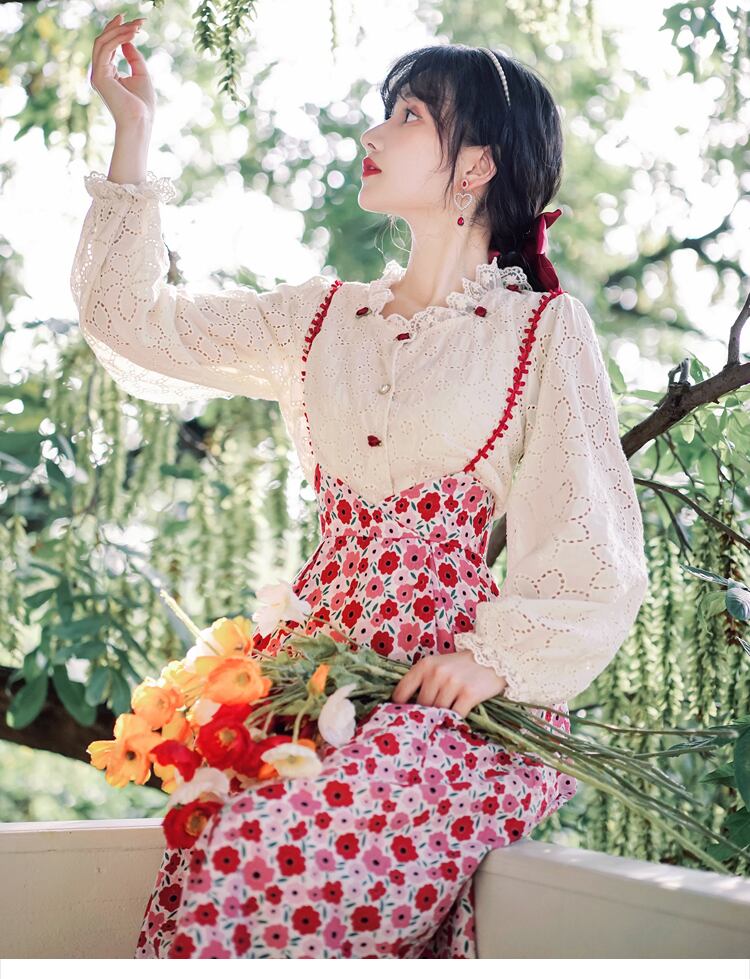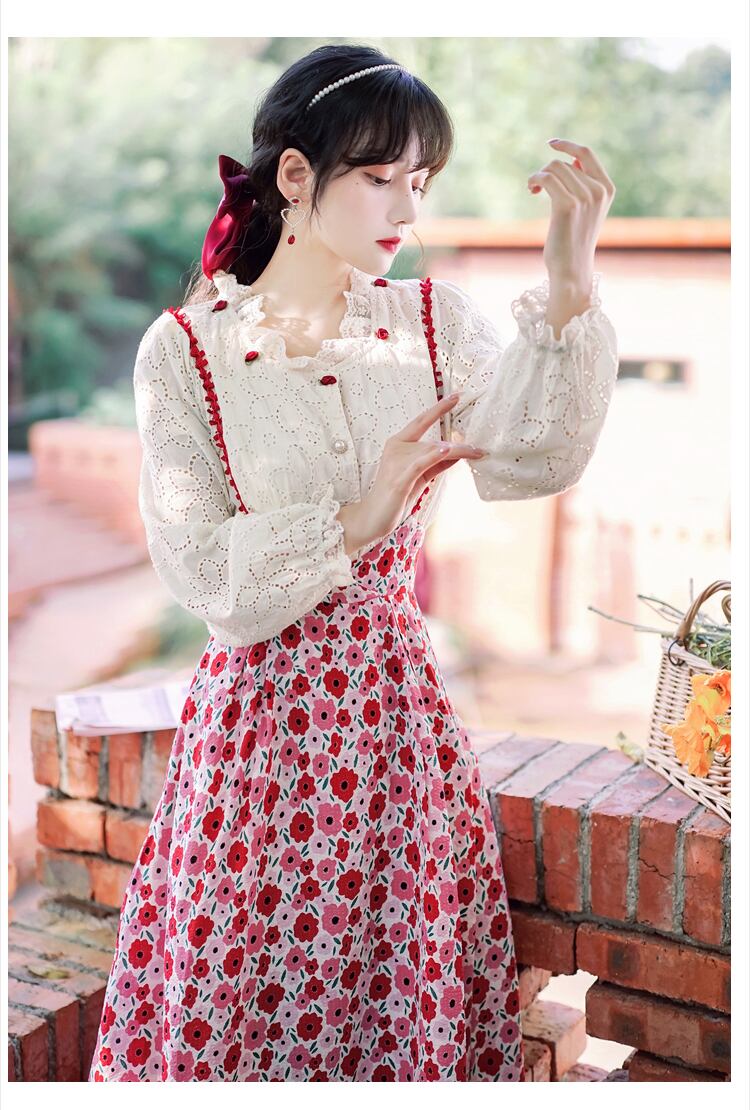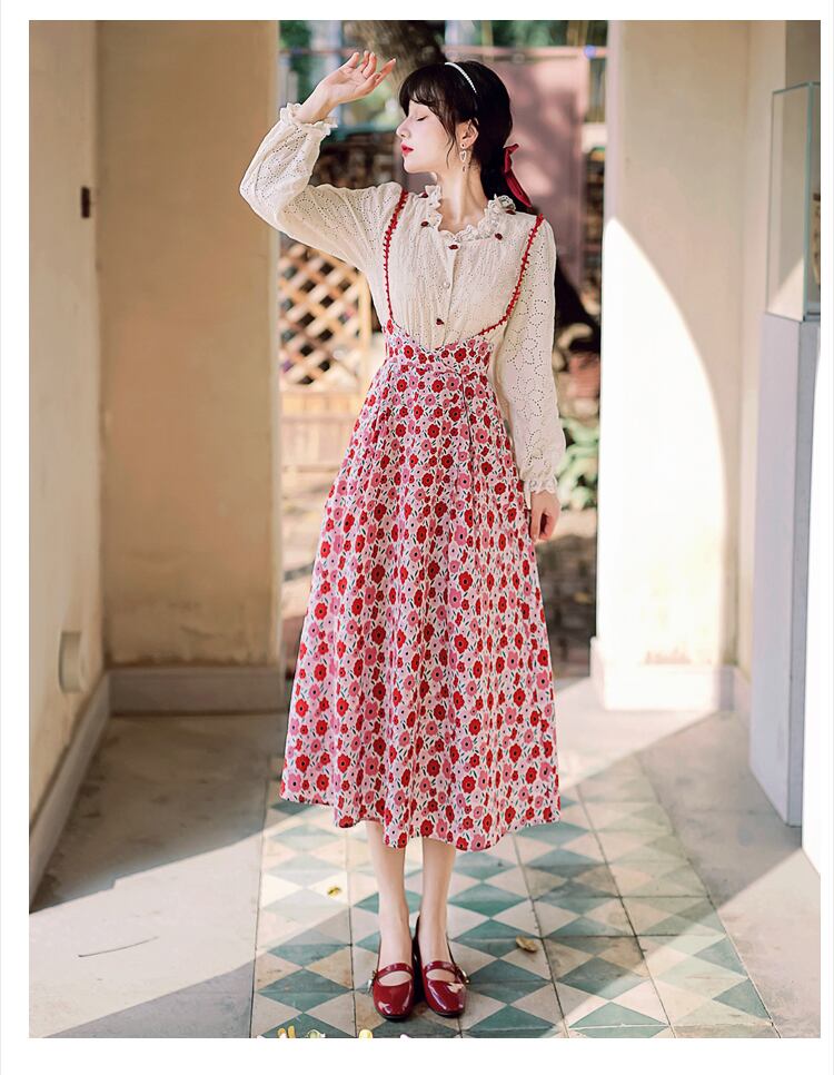 送料無料୨♥୧ 森草原シックレディース2個セット 刺繍ランタンスリーブローズレースフローラルミディスカート スーツ AOS37115175337