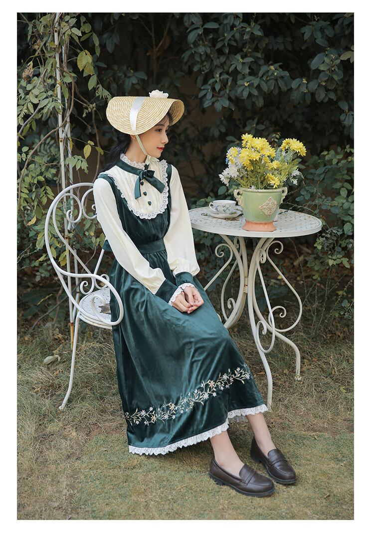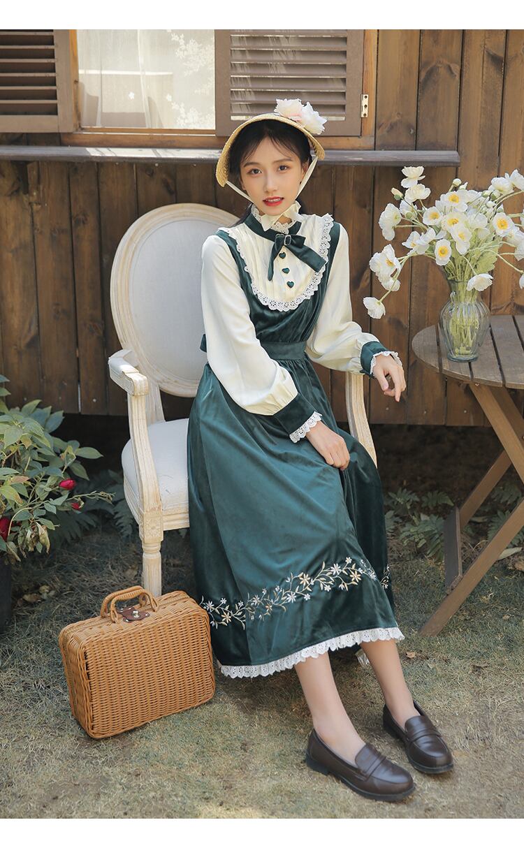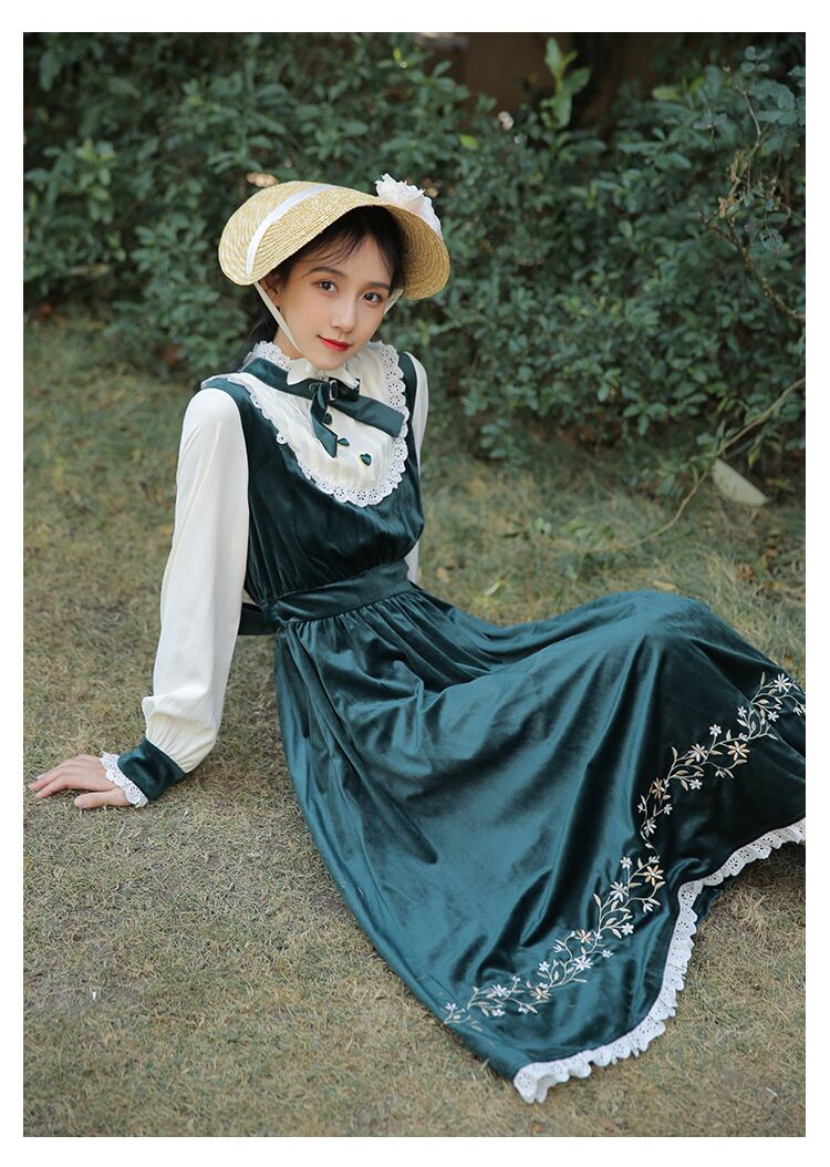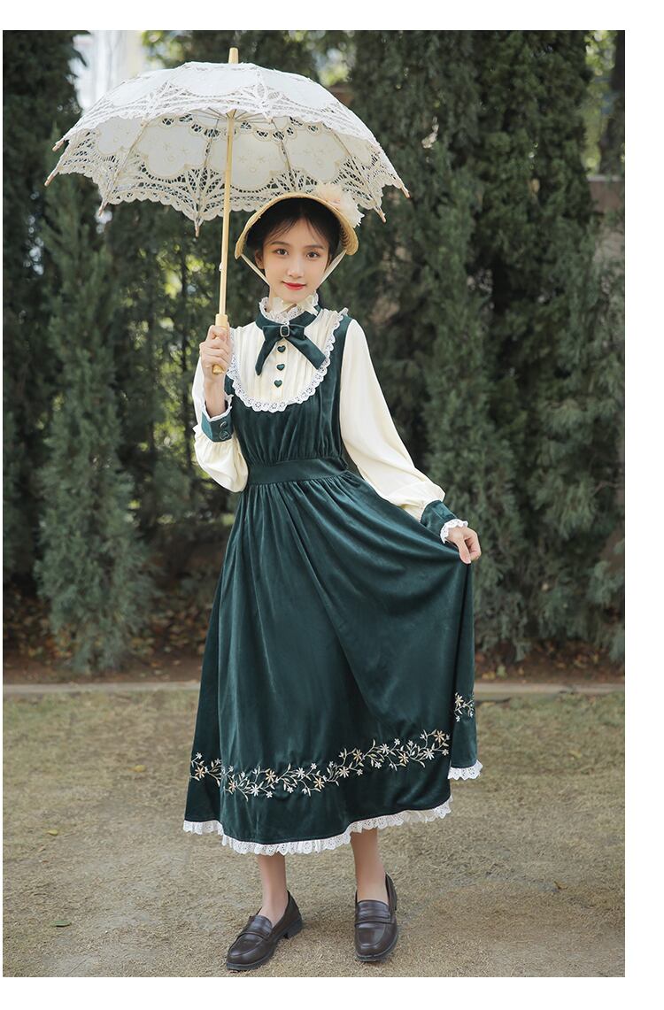 送料無料୨♥୧ 森オータムウィンターロングドレス カラーリボンフローラル刺繍ゴージャスレースフリルグリーンベルベットロリータドレス ワンピース AOS97628297195