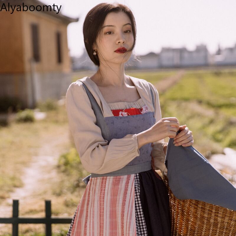 送料無料୨♥୧ 森スプリングオータムレディースロングドレス コントラストカラー格子柄パッチワークサッシヴィンテージ草原シック AOS34976686357