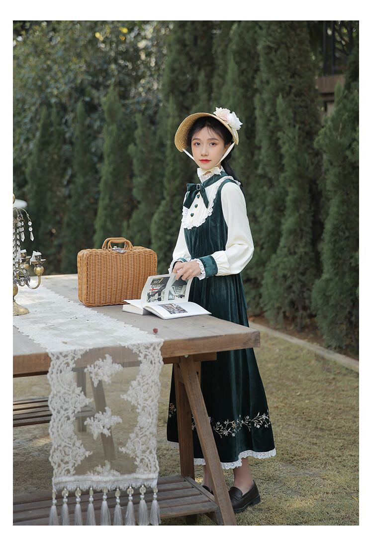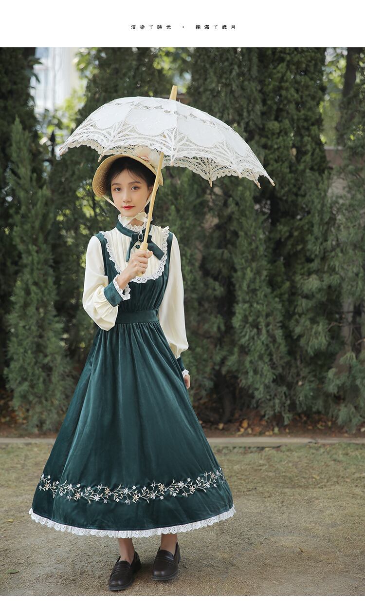 送料無料୨♥୧ オータムウィンターロングドレス カラーリボンフローラル刺繍レースフリルグリーンベルベットドレス ワンピース ラッフル 大人ガーリー スウィート キュート カジュアル 秋物 冬物 花柄 AOS85799450289