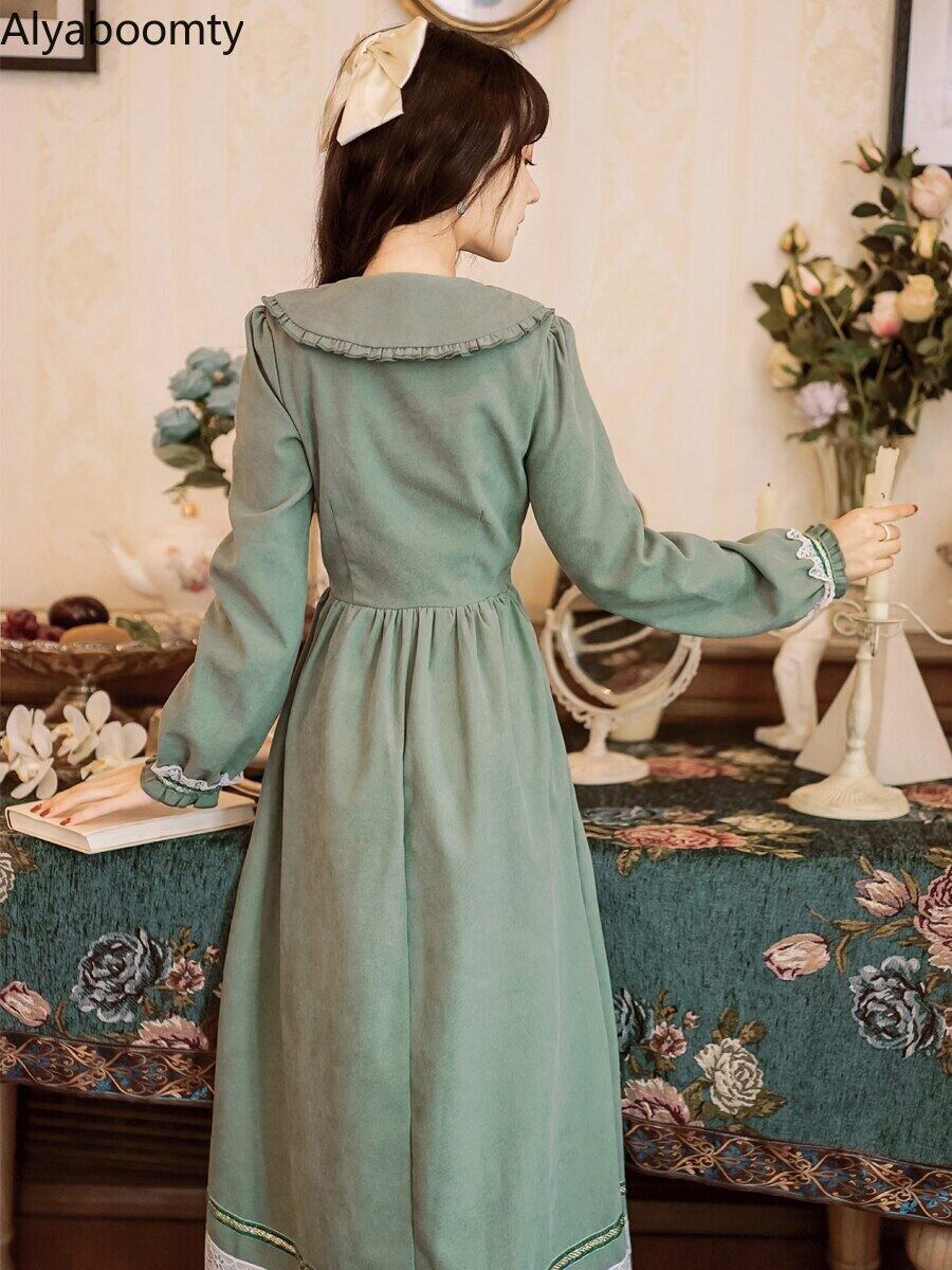 送料無料୨♥୧ スプリングレディースロングドレス カラーフローラル刺繍レースフリルヴィンテージグリーン ラッフル 大人ガーリー スウィート キュート カジュアル 春物 花柄 ビンテージ AOS1249531850