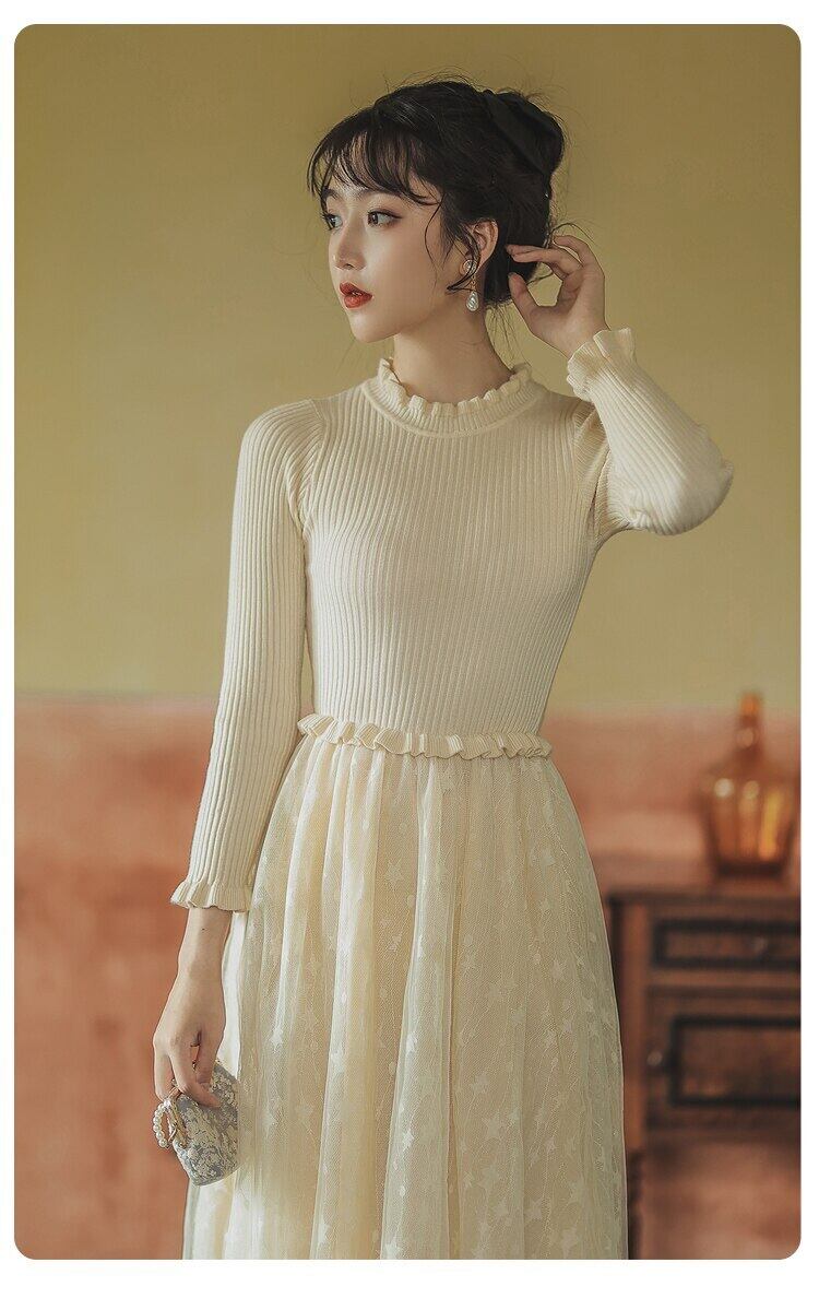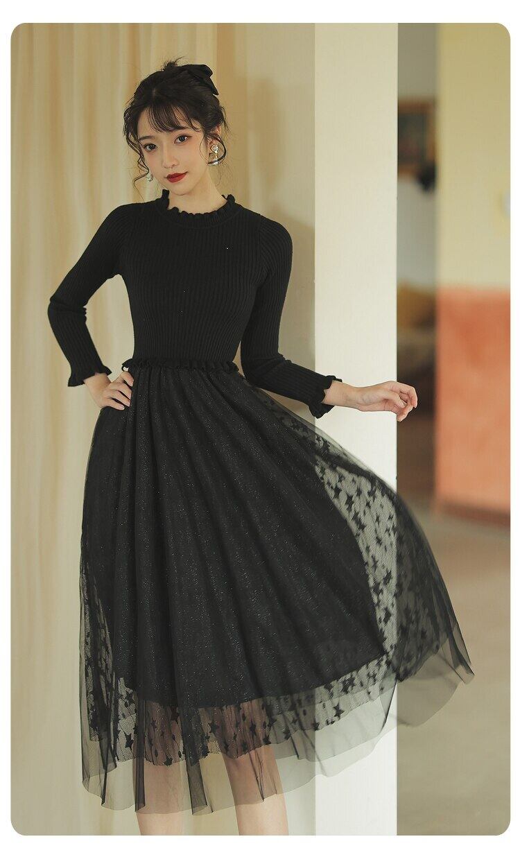 送料無料୨♥୧ ウィンターレディースセーター ドレス ベージュブラックニット パッチワークメッシュロング 大人ガーリー スウィート キュート カジュアル 冬物 AOS68333351098