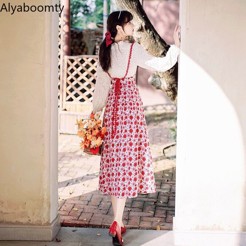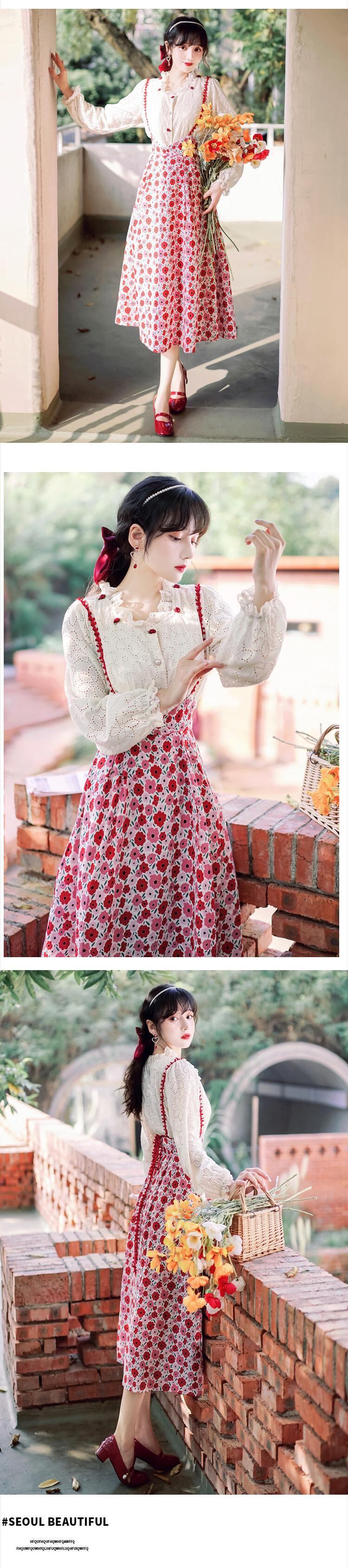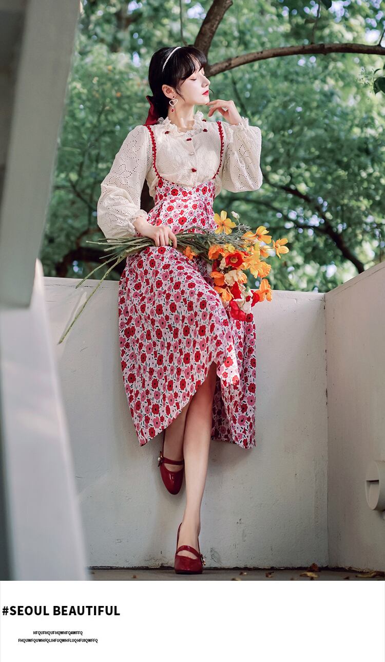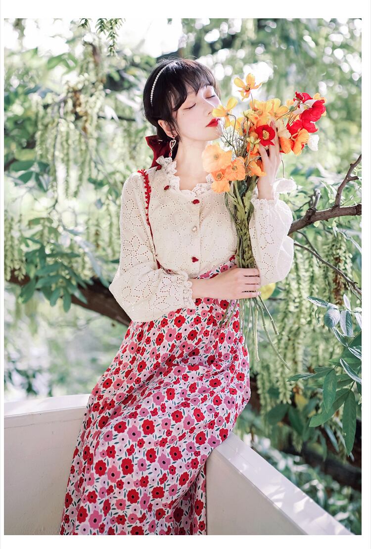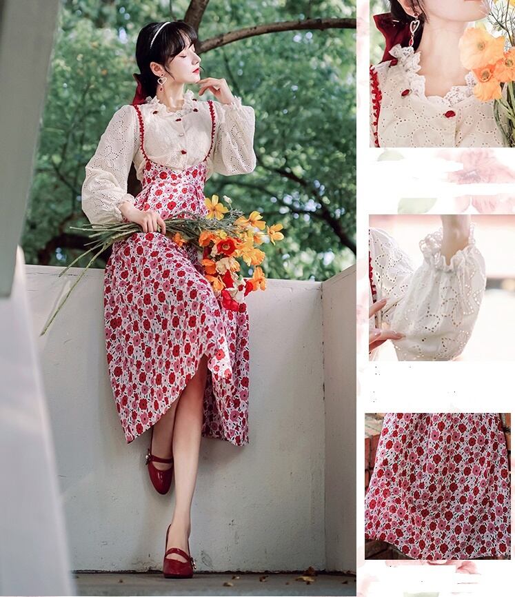 送料無料୨♥୧ レディースセット 刺繍スリーブレースフローラルミディスカート ランタンスリーブ 大人ガーリー スウィート キュート カジュアル 花柄 AOS7528957023