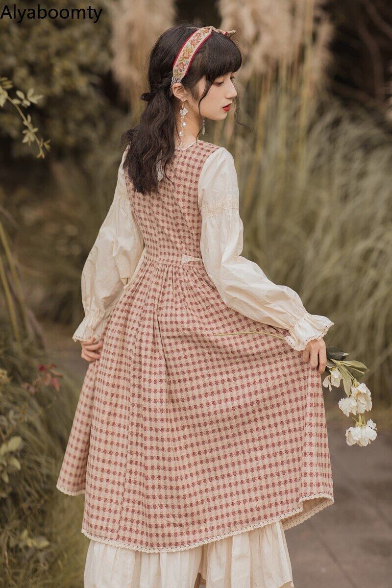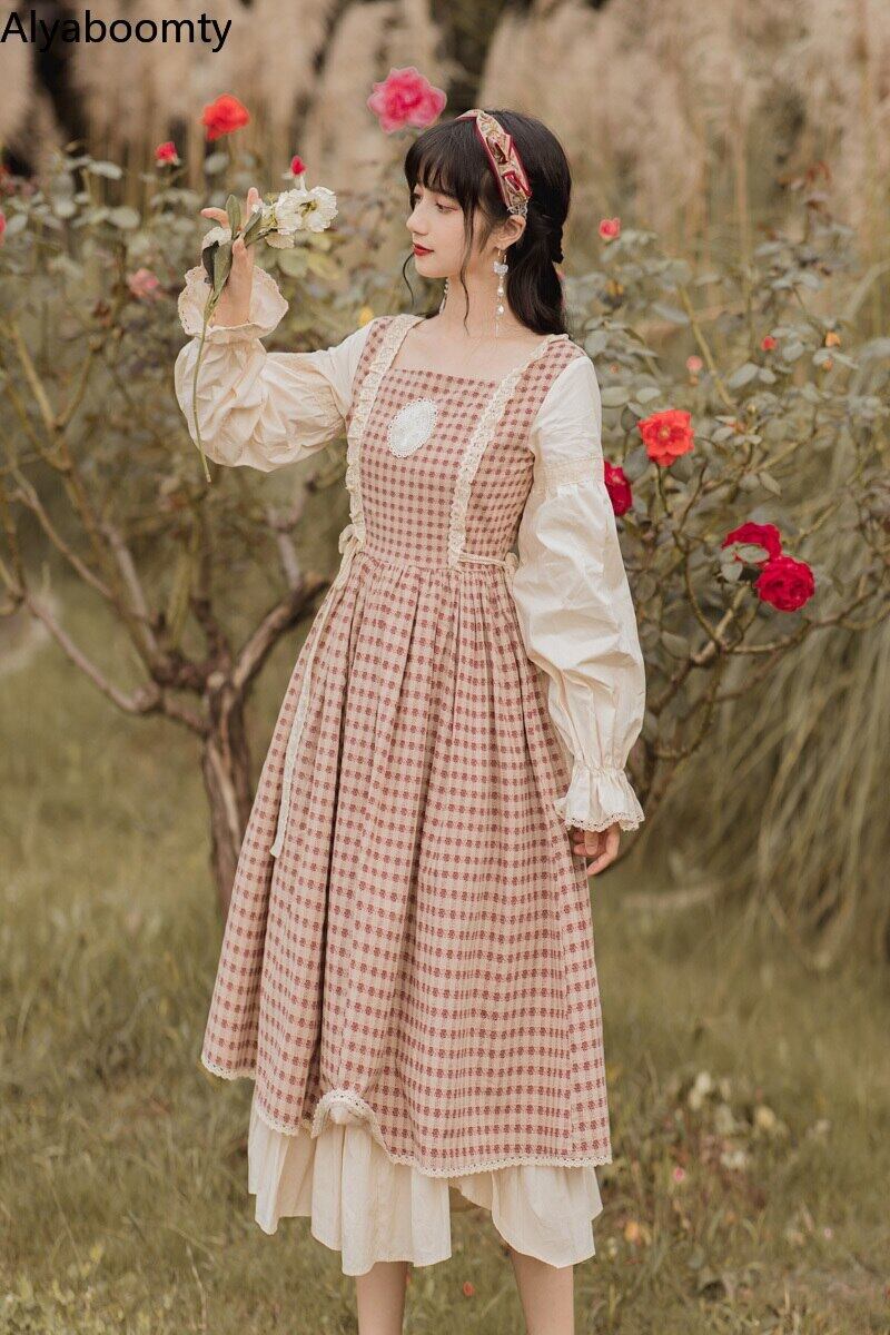 送料無料୨♥୧ スプリングオータムレディースミディドレス パッチワーク格子柄レースフリルスタンダード レトロ ラッフル 大人ガーリー スウィート キュート カジュアル 春物 秋物 AOS80748790019