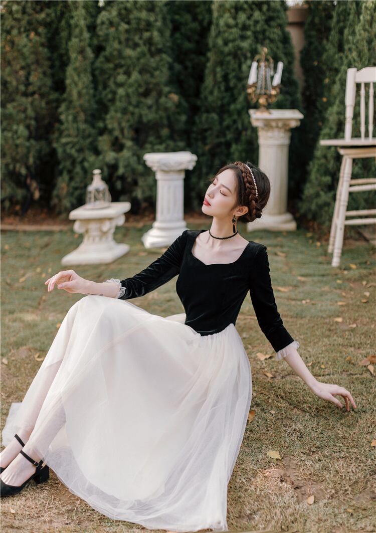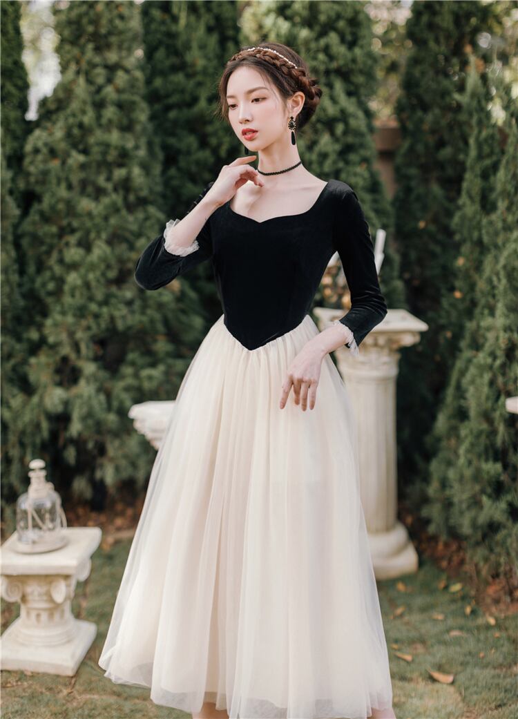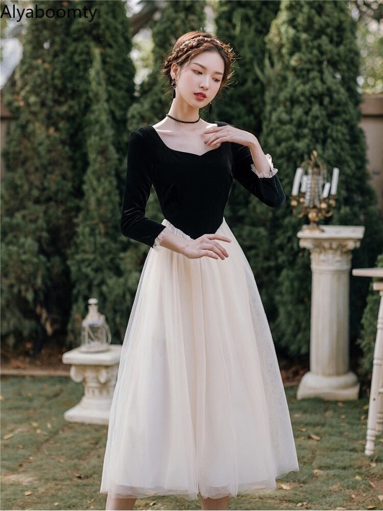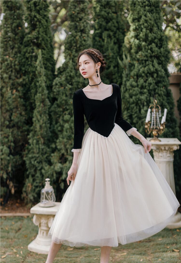 送料無料୨♥୧ スプリングオータムフランス語レディース妖精ミディドレス ブラックベルベットパッチワークメッシュパーティー七部袖スリーブチュール AOS75922712561