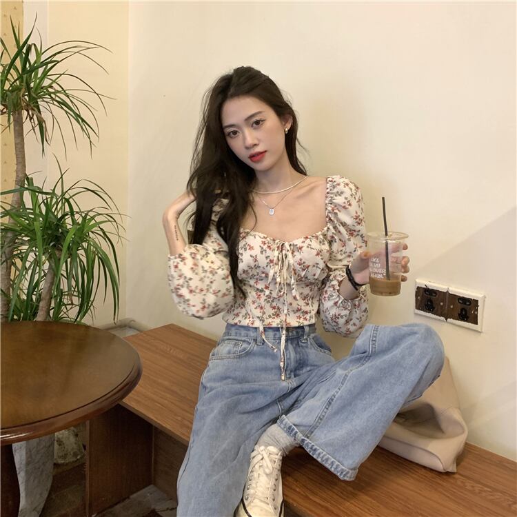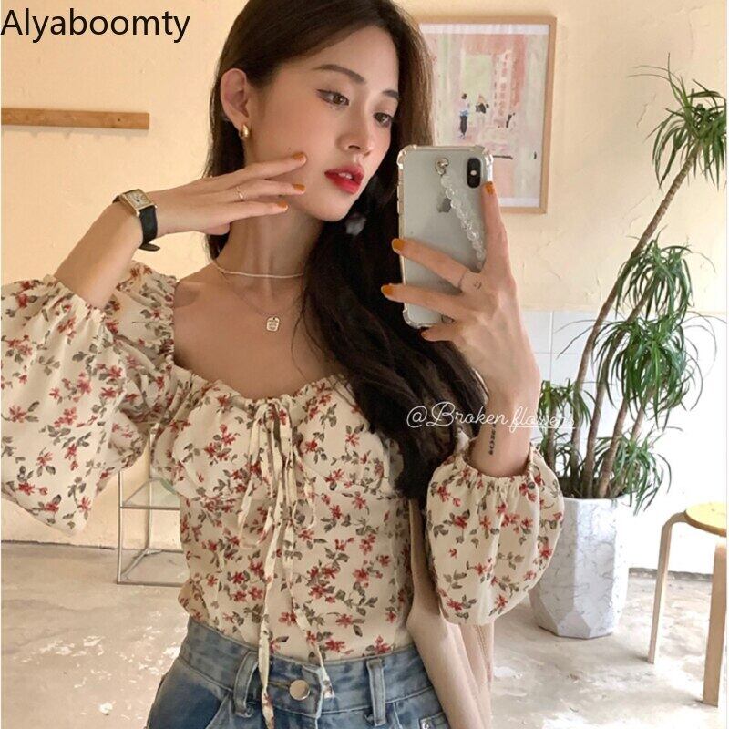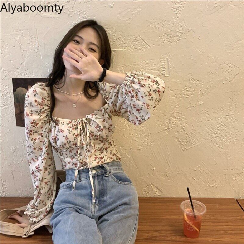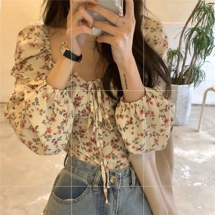 送料無料୨♥୧ レディースストリートウェアクロップトップ トップス カラーフローラルプリントブラウス スリーブショート 花柄 スクウェア AOS25348678394