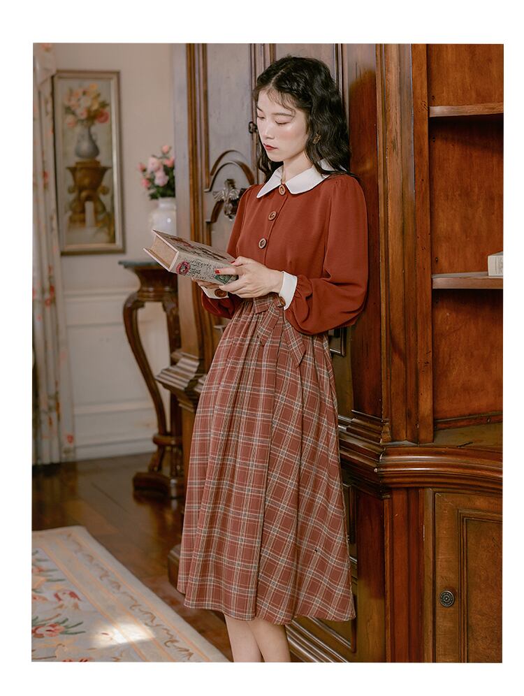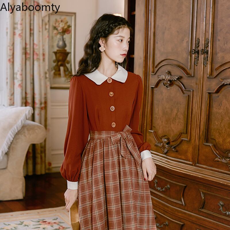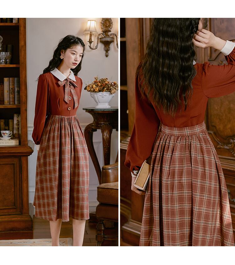 送料無料୨♥୧ スタイルスプリングオータムレディースミディドレス パッチワーク格子柄リボンヴィンテージスリーブ ランタンスリーブ 春物 秋物 ビンテージ ヨーロピアン AOS29179179194