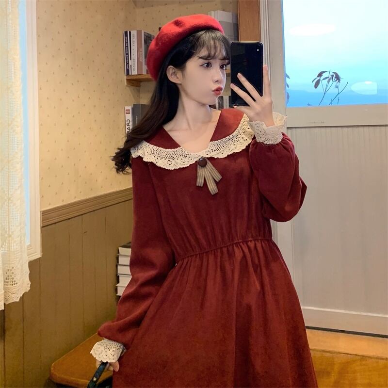 送料無料୨♥୧ ese森レディースロングドレス ピーターパンカラーとレースレッドブラック甘いシックコーデュロイヴィンテージ AOS61028107994