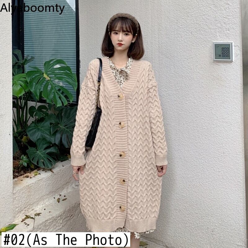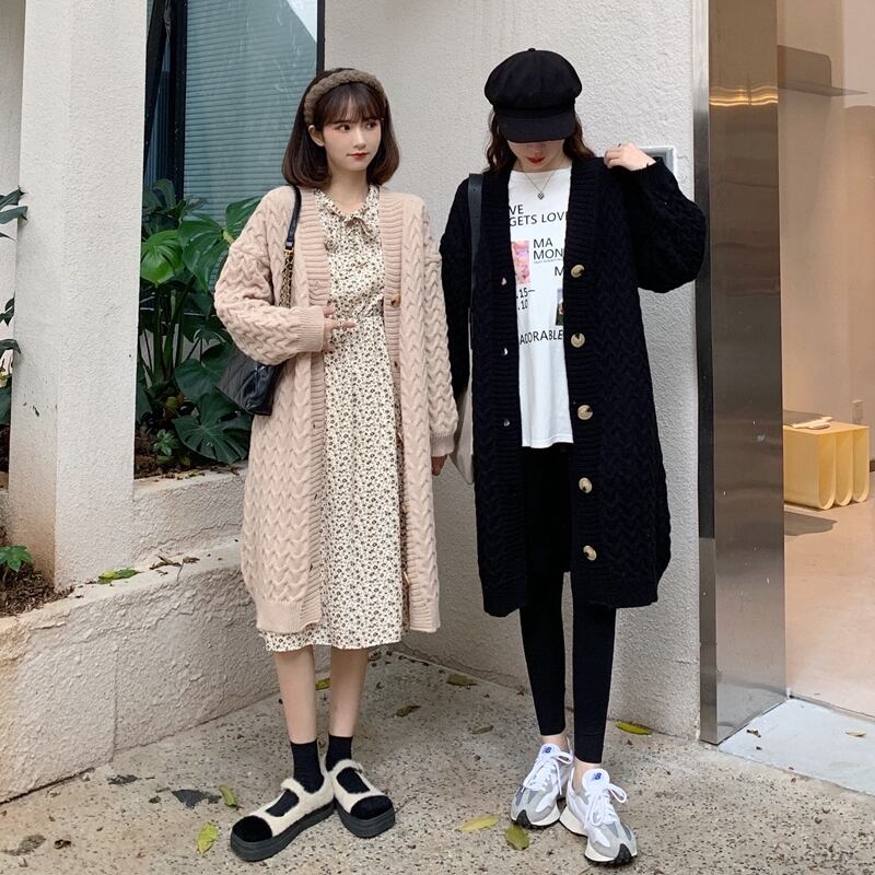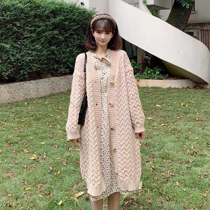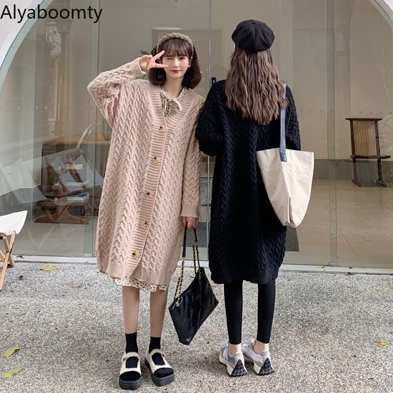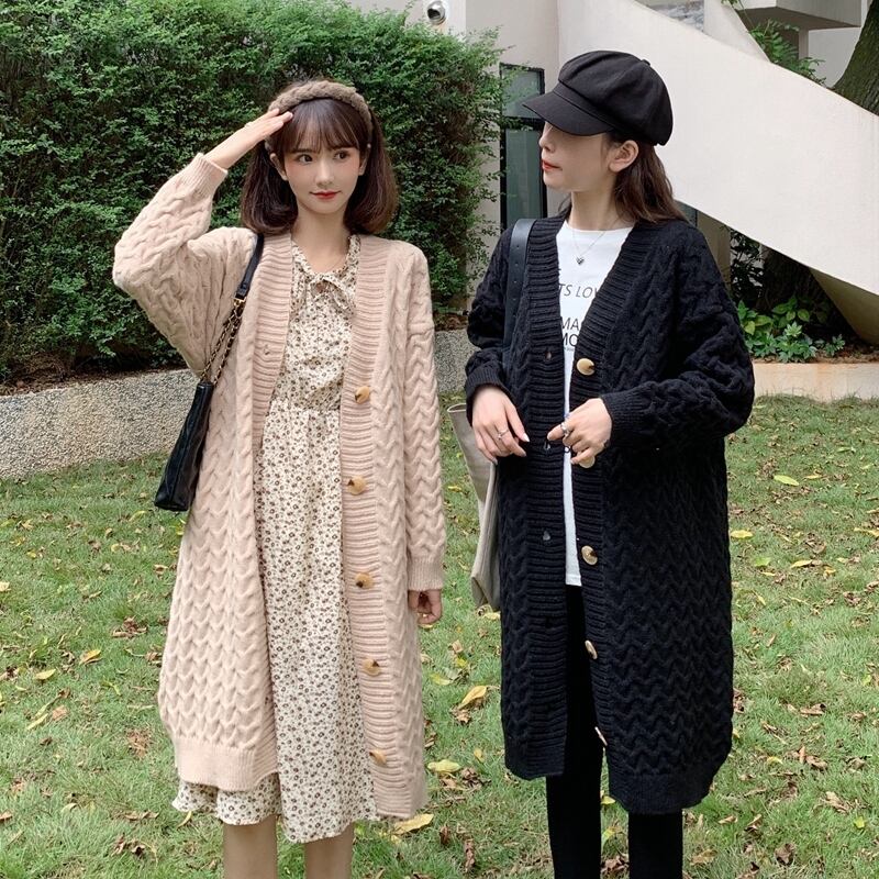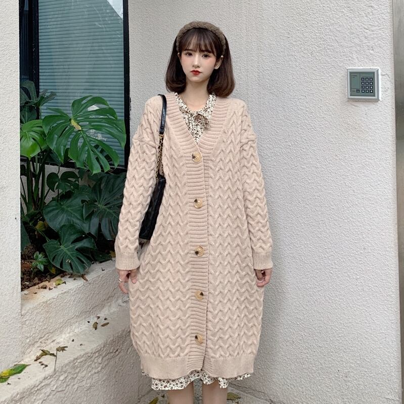 送料無料୨♥୧ eseプレッピースタイル秋ウィンターレディースロングカーディガンアプリコットブラック特大バギーニットセーター ルーズアウター AOS21405635133