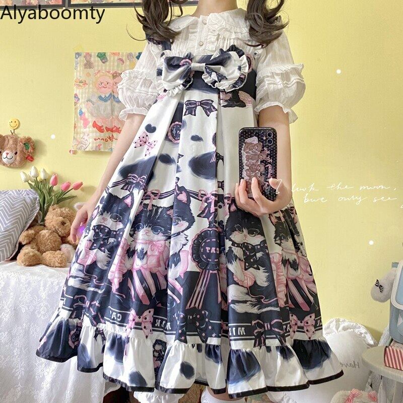 送料無料୨♥୧ eseサマーロリータスタイルレディースjskドレス 牛動物プリント柄フリルノースリーブ可愛い甘い AOS13408843828