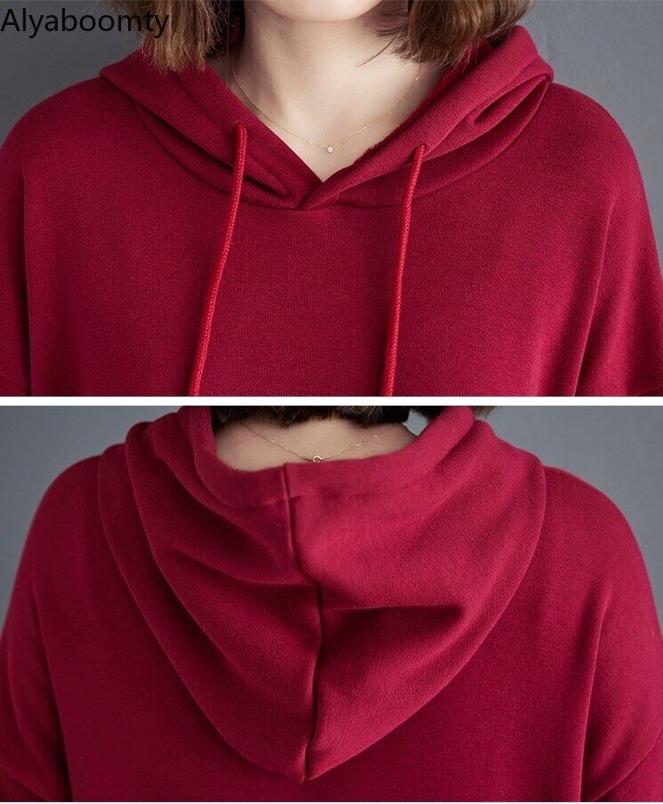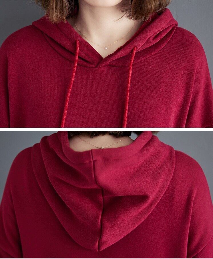 送料無料୨♥୧ オータムウィンターレディーストランペットミディドレス フードレッドブラックフリース厚い長袖スリーブ特大パーカー AOS14301333843