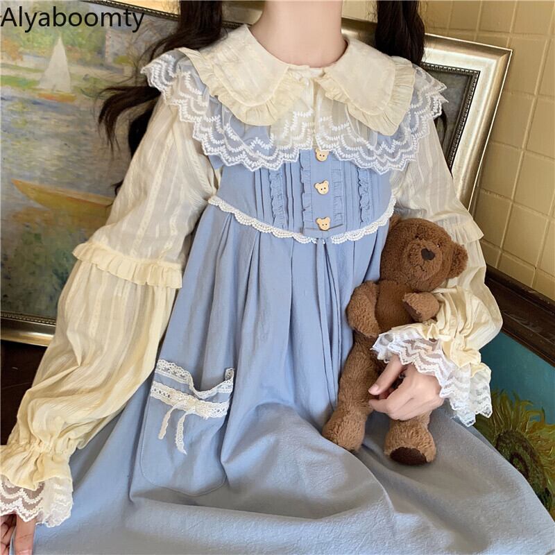 送料無料୨♥୧ eseロリータスタイルスプリングオータムレディースブラウス ピーターパンカラーホワイトアプリコット甘い可愛いレースフリルjskシャツ AOS7978973033