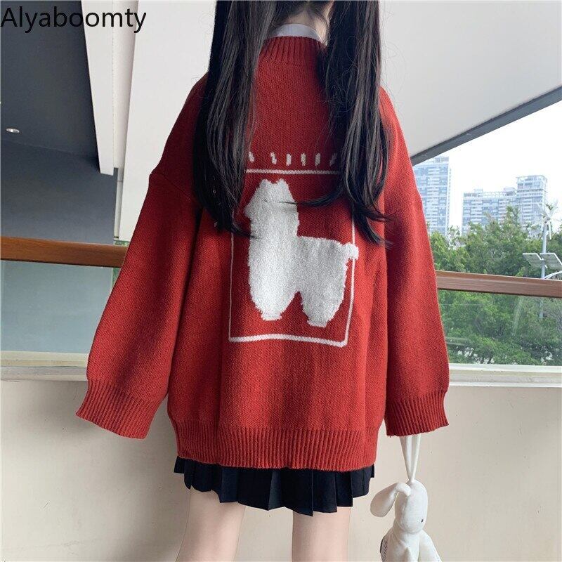 送料無料୨♥୧ eseプレッピースタイルスプリングオータムレディースセーター Vネック特大動物パターンニットカーディガン可愛いルーズアウター AOS79822172607