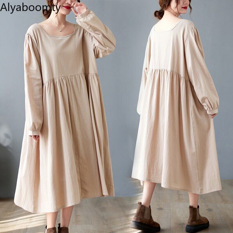 送料無料୨♥୧ スプリングオータムレディース特大ルーズソリッド コットンバギーミディドレス 長袖スリーブヴィンテージガウン AOS10850419068