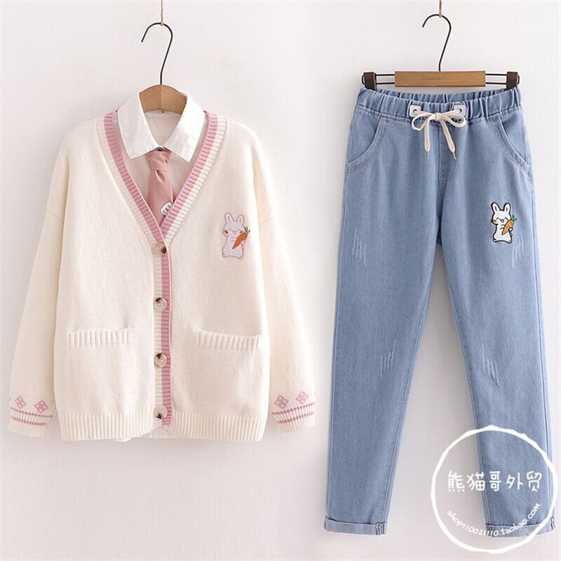 送料無料୨♥୧ ese森スプリングオータムレディースカーディガンベージュネイビーブルーピンク刺繍ウサギセーター 可愛いバニーアウター AOS84132800380