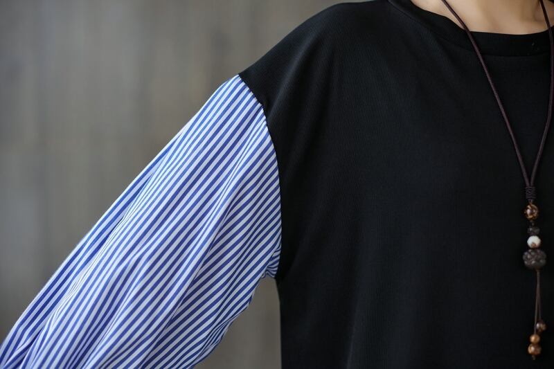 送料無料୨♥୧ スタイルスプリングオータムレディースドレス カラーパッチワークストライプ長袖スリーブルーズドレス ワンピース ロング 春物 秋物 Oネック AOS89572783584