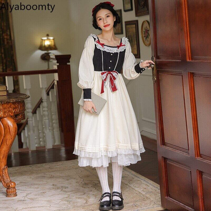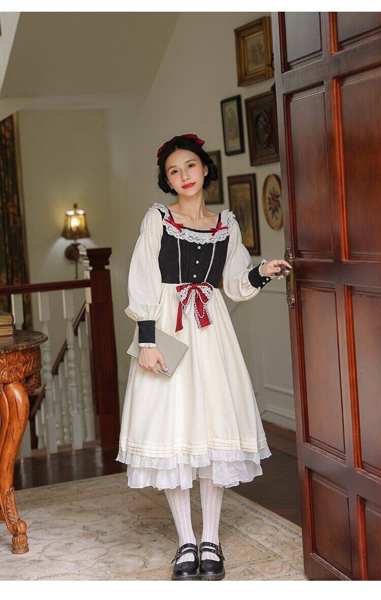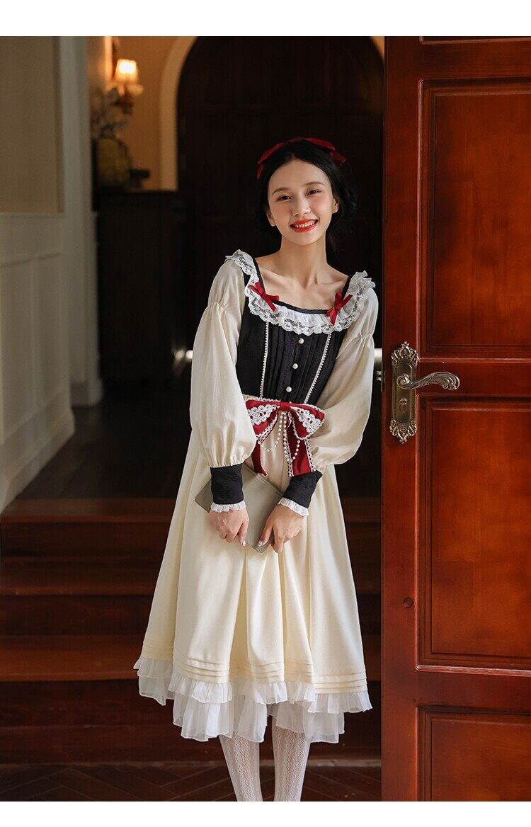 送料無料୨♥୧ レディースドレス カラーパッチワークリボンスリーブフリルヴィンテージドレス ワンピース ラッフル 大人ガーリー スウィート キュート カジュアル スクウェア ビンテージ AOS81687789403
