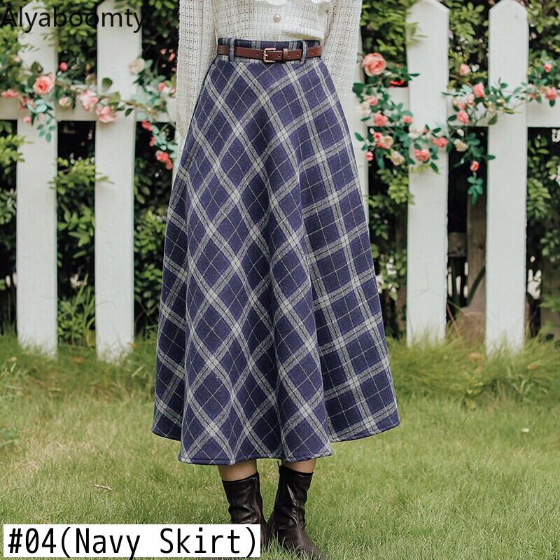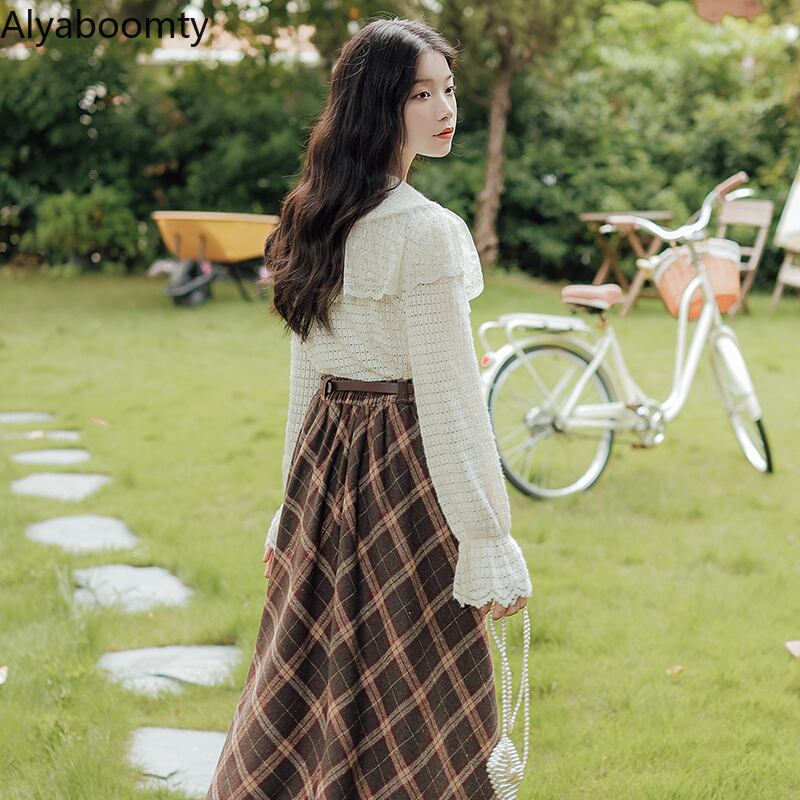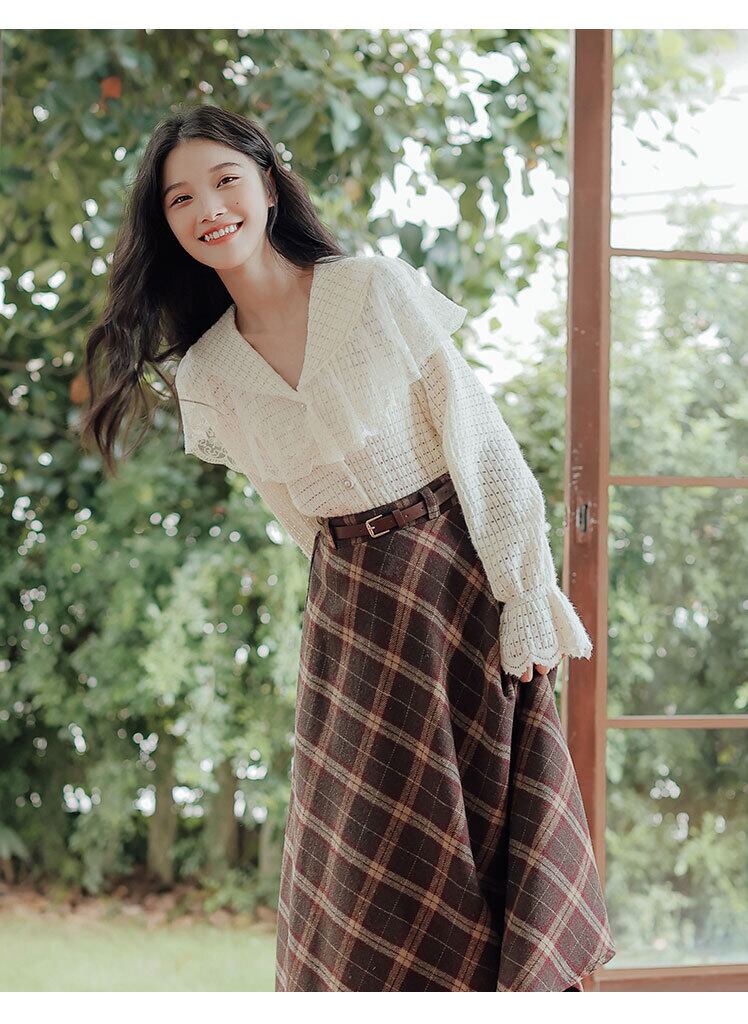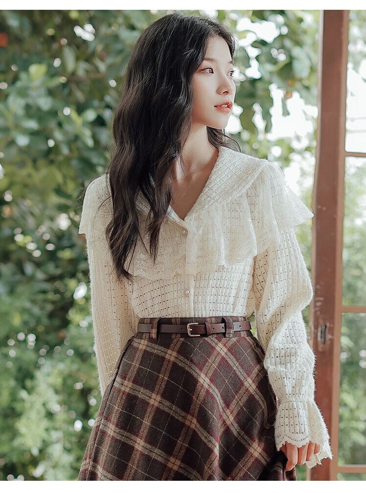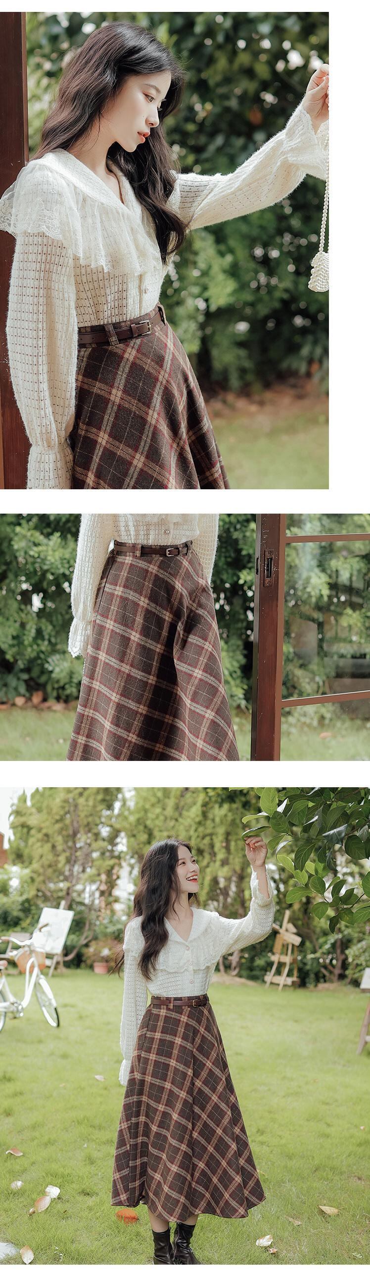 送料無料୨♥୧ スプリングオータムセット ニットレース格子柄ベルト ミディスカート スタイル 大人ガーリー スウィート キュート カジュアル 春物 秋物 ハーネス ヨーロピアン AOS43075622197