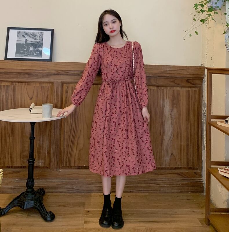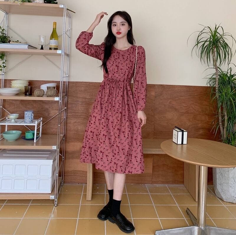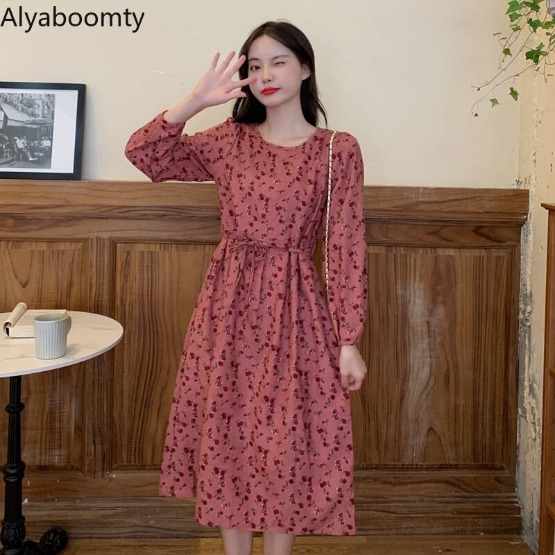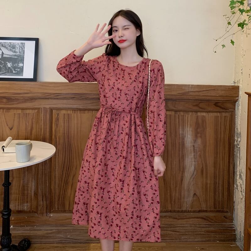 送料無料୨♥୧ スプリングオータムレディースAラインコーデュロイドレス ラウンドネックフローラルレース長袖スリーブヴィンテージドレス ワンピース ロング 大人ガーリー スウィート キュート カジュアル 春物 秋物 花柄 Oネック レースアップ ビンテージ AOS13642876497