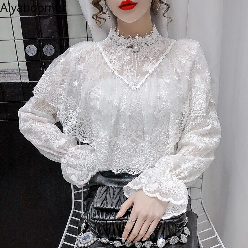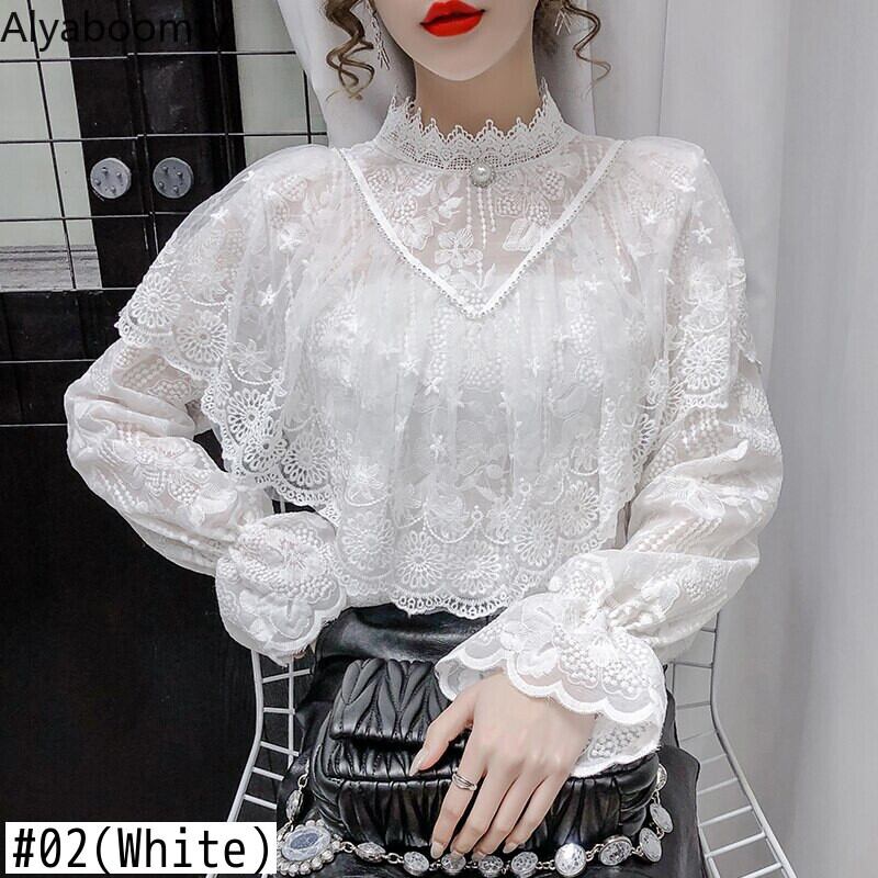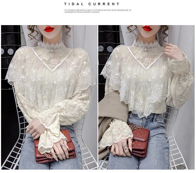 送料無料୨♥୧ シックオータムレディースレースブラウス スタンドカラーカラーホワイトアプリコットフローラルホローでるフリルトップス AOS66278058606