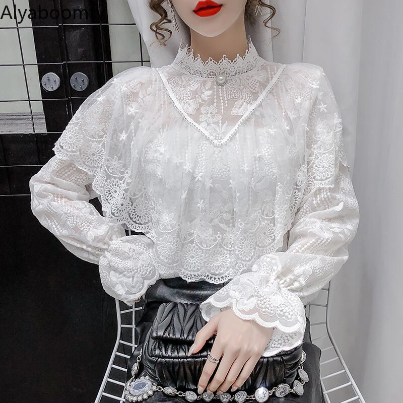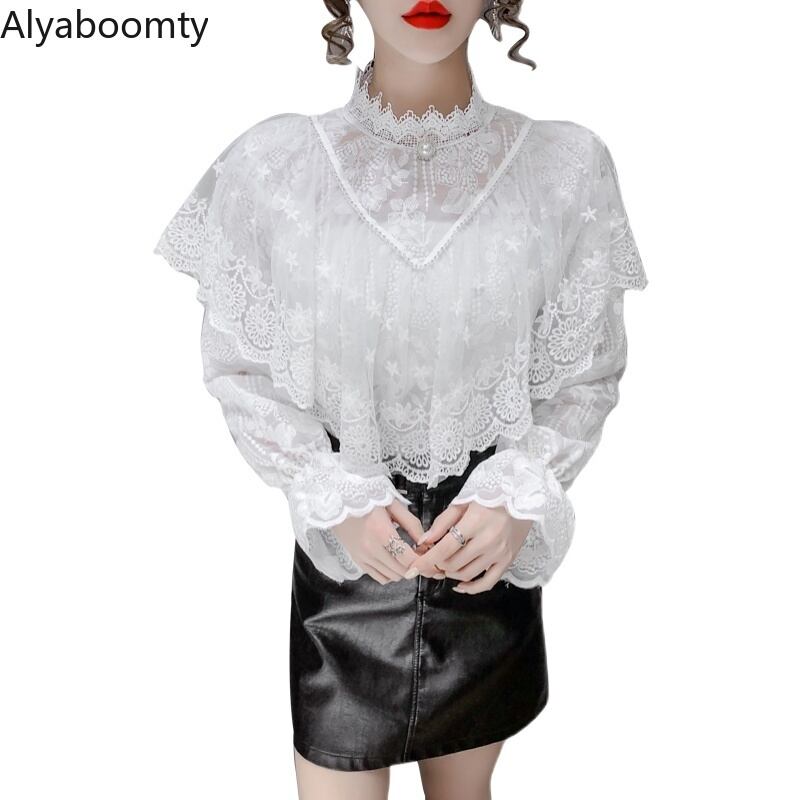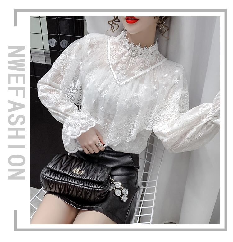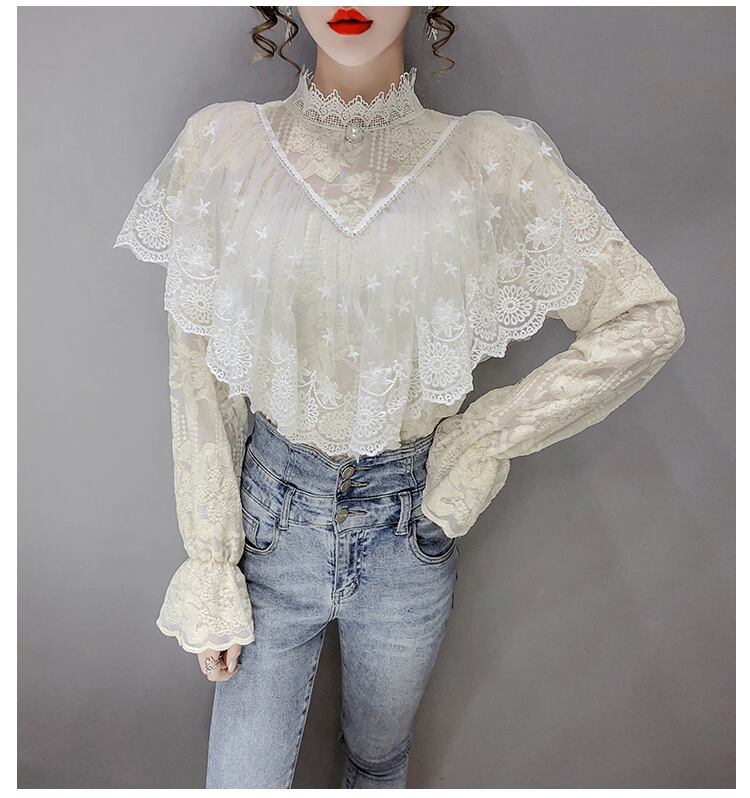送料無料୨♥୧ オータムレディースレースブラウス スタンドカラーカラーホワイトフローラルフリルトップス ラッフル 秋物 花柄 AOS37093149982