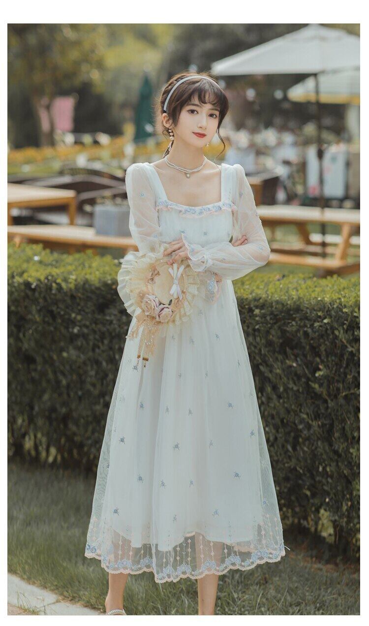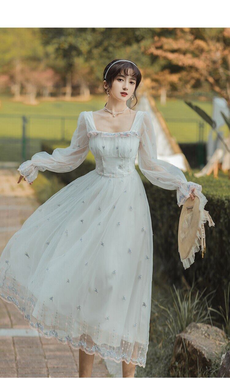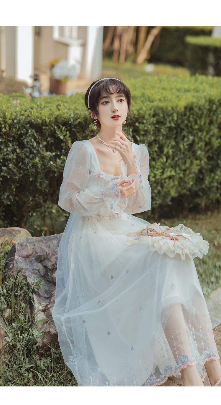 送料無料୨♥୧ スプリングオータムレディースロング妖精メッシュドレス 平方カラーフローラル刺繍パーティー甘いチュールホワイト AOS46723907679