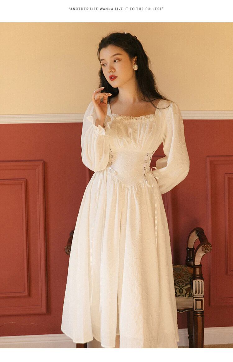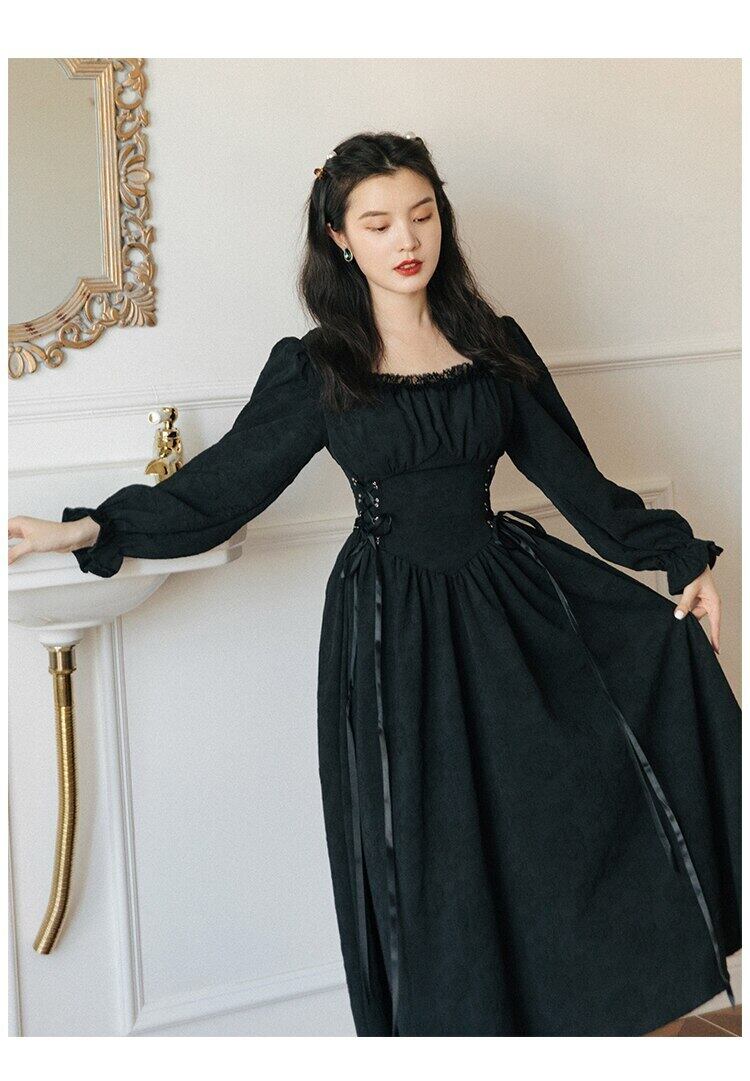 送料無料୨♥୧ フランス語スタイルスプリングオータムレディースロング妖精ドレス 平方カラーホワイトブラックジャカードバンドクリカルシック AOS93143019401