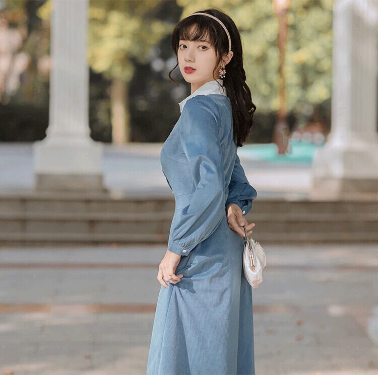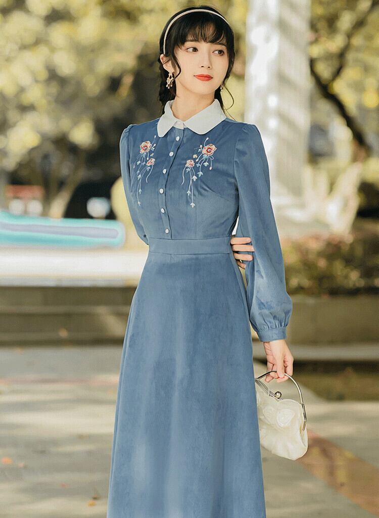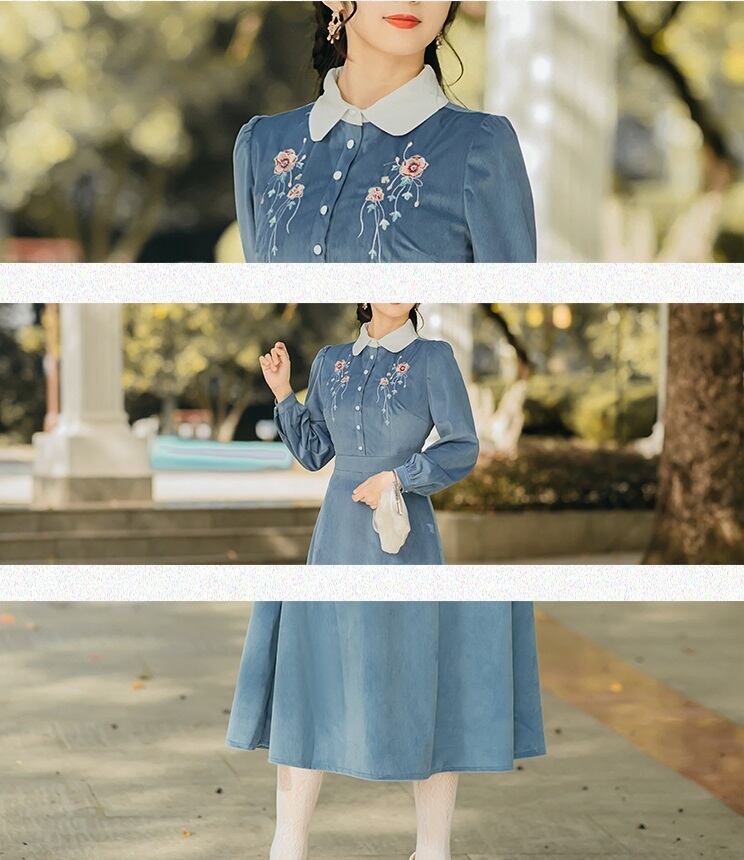 送料無料୨♥୧ スプリングオータムレディースドレス カラーブルーフローラル刺繍コーデュロイヴィンテージ 大人ガーリー スウィート キュート カジュアル 春物 秋物 花柄 ビンテージ AOS22205205482