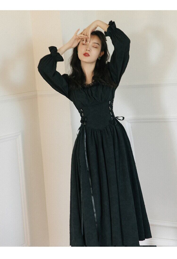 送料無料୨♥୧ スタイルスプリングオータムレディースロングドレス カラーホワイトブラックジャカードバンド 春物 秋物 スクウェア AOS93963741668