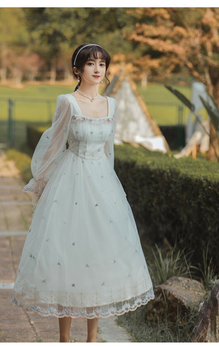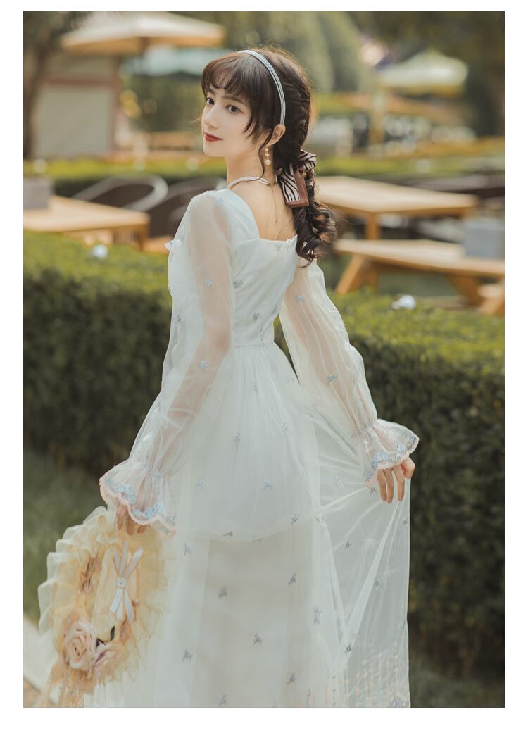 送料無料୨♥୧ スプリングオータムレディースロングメッシュドレス カラーフローラル刺繍ホワイト 大人ガーリー スウィート キュート カジュアル 春物 秋物 花柄 スクウェア AOS22096523262