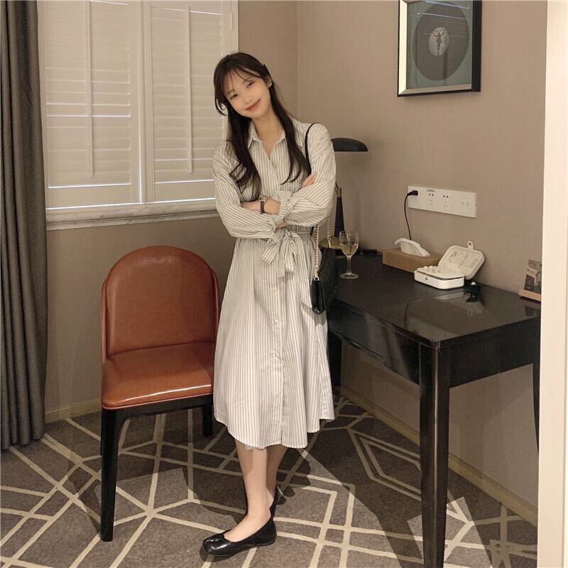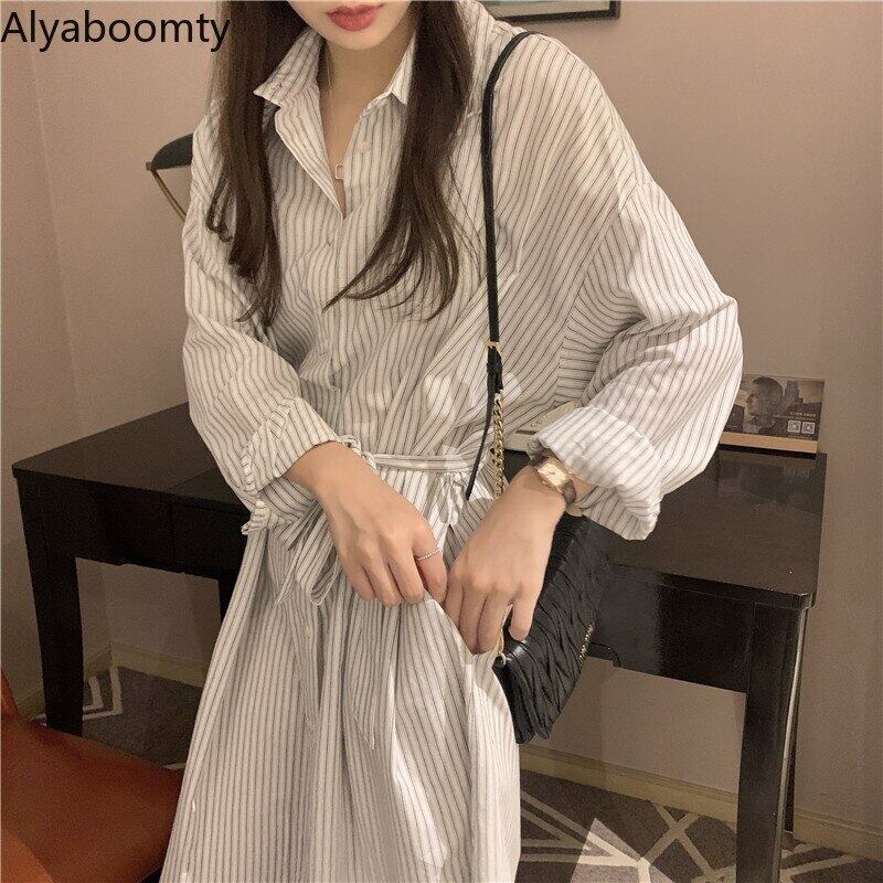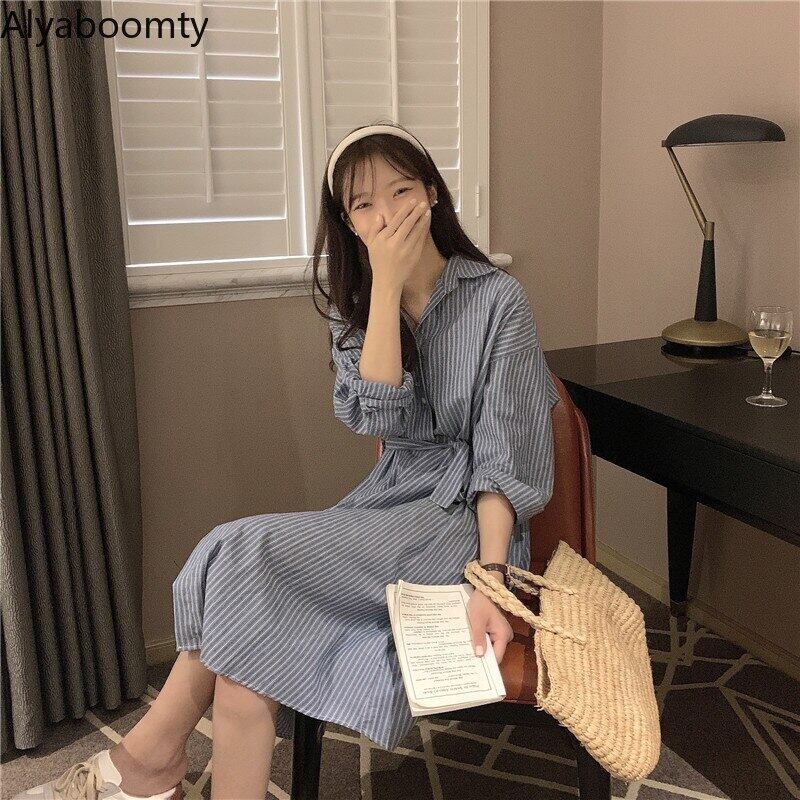 送料無料୨♥୧ スプリングオータムレディースルーズミディドレス 断るカラーブルーストライプヴィンテージ特大シャツ とベルト AOS68754218683