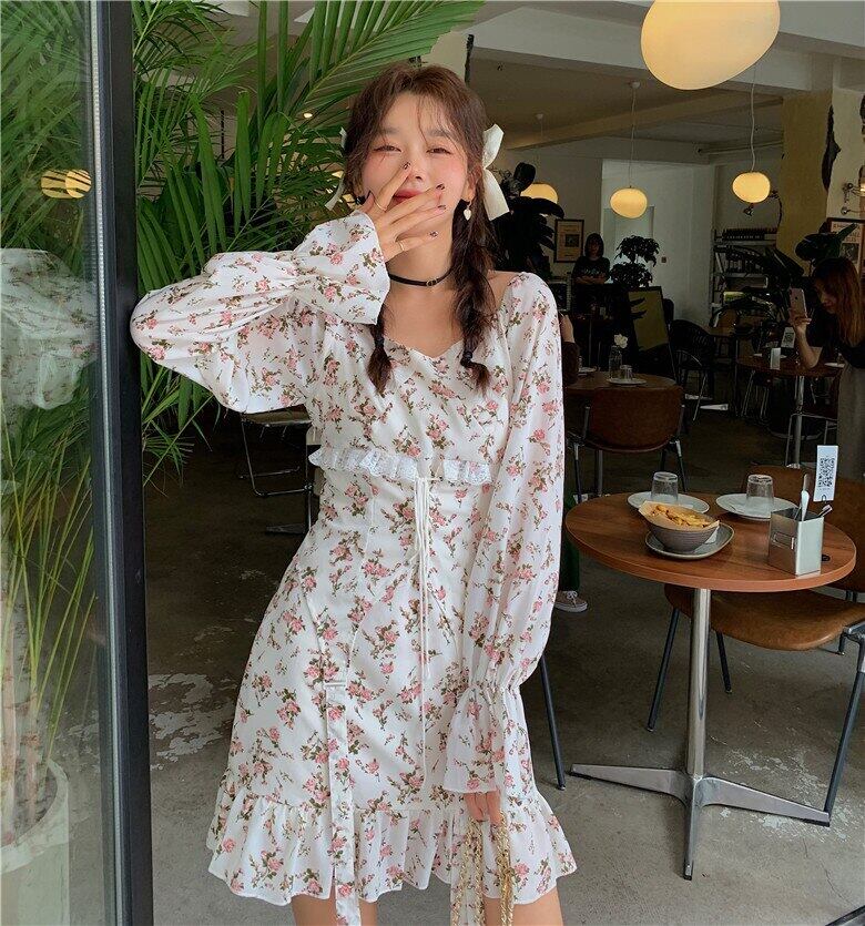 送料無料୨♥୧ ese原宿スプリングオータムレディースミニドレス 平方カラーフローラルプリントレースアップ甘い可愛いフリルシック AOS2411275128
