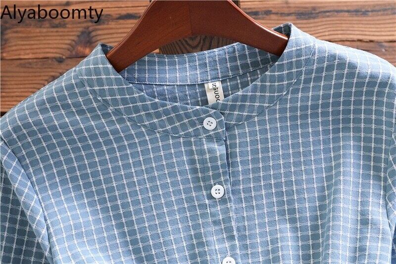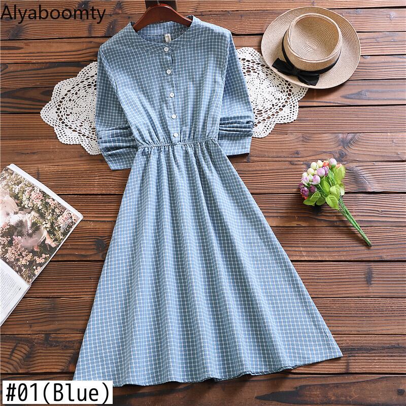 送料無料୨♥୧ 森oスプリングオータムレディースAラインドレス 首ブルー格子柄長袖スリーブシック AOS55839337891
