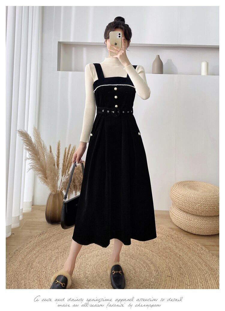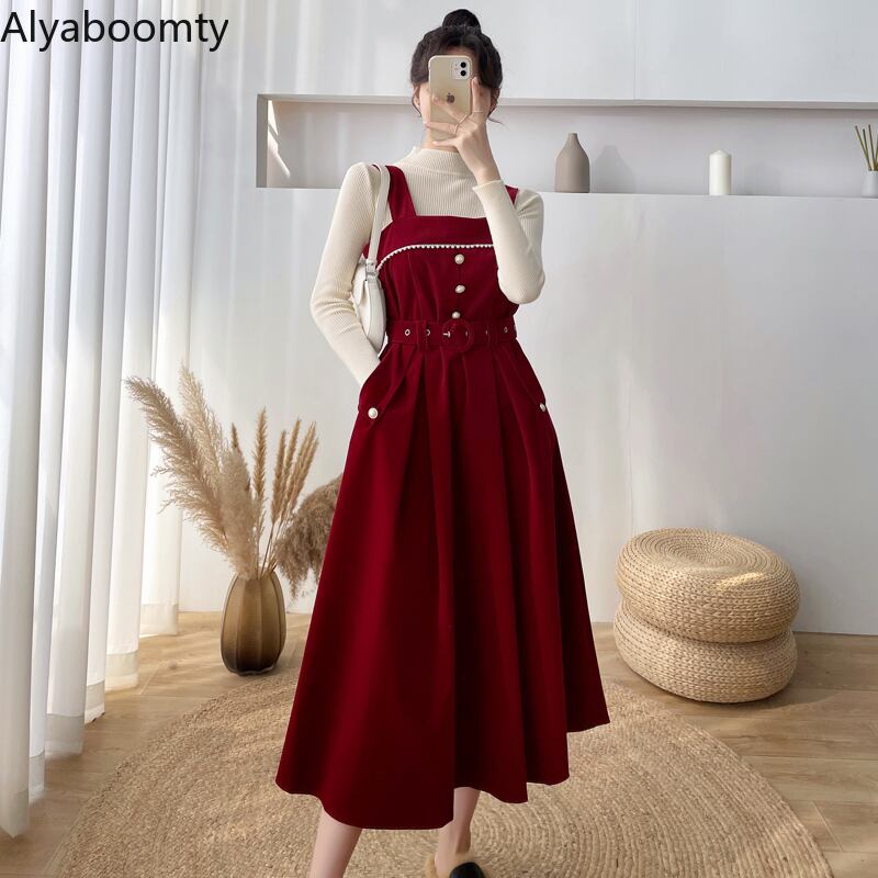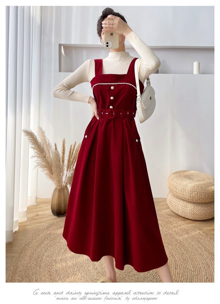 送料無料୨♥୧ 森スプリングオータムレディースミディドレス ブラックレッドブルー甘いコーデュロイノースリーブとベルト AOS39263589367