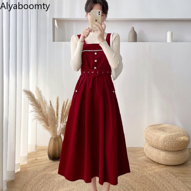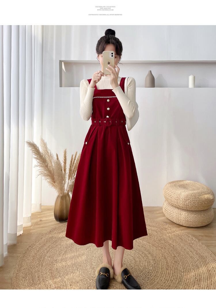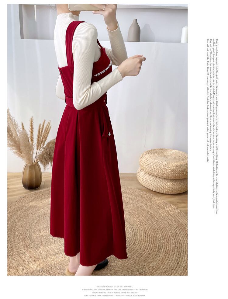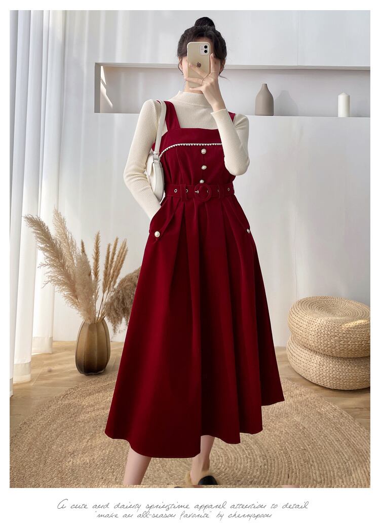 送料無料୨♥୧ スプリングオータムレディースミディドレス ブラックレッドブルーコーデュロイノースリーブベルト 大人ガーリー スウィート キュート カジュアル 春物 秋物 ハーネス AOS32048963442
