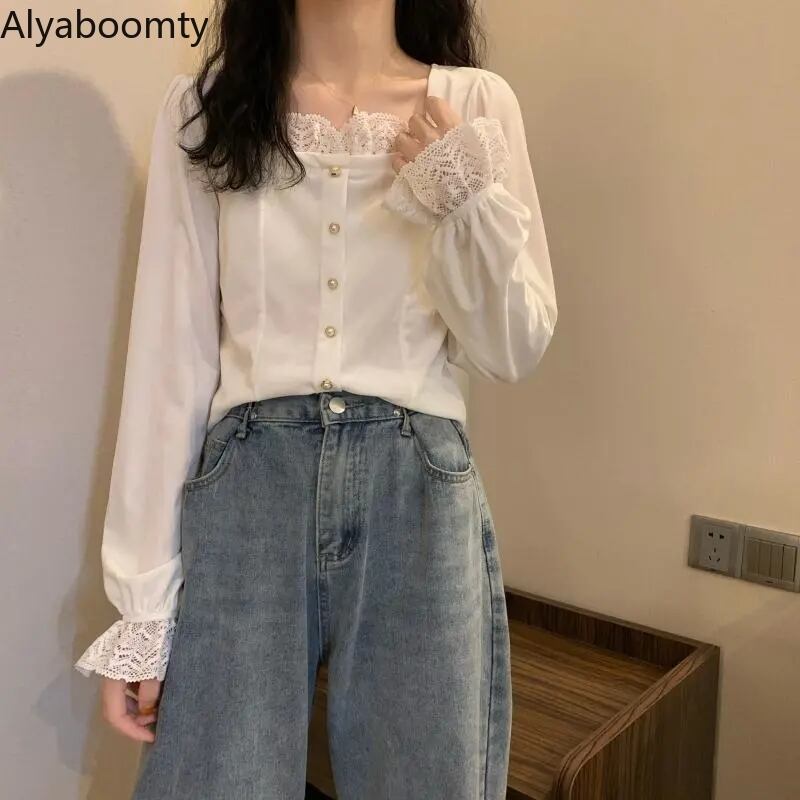 送料無料୨♥୧ スプリングオータムレディースベルベットシャツ ホワイトブラックカラーレースクロップトップ トップス ストリートウェア ロング 春物 秋物 スクウェア AOS95471536363