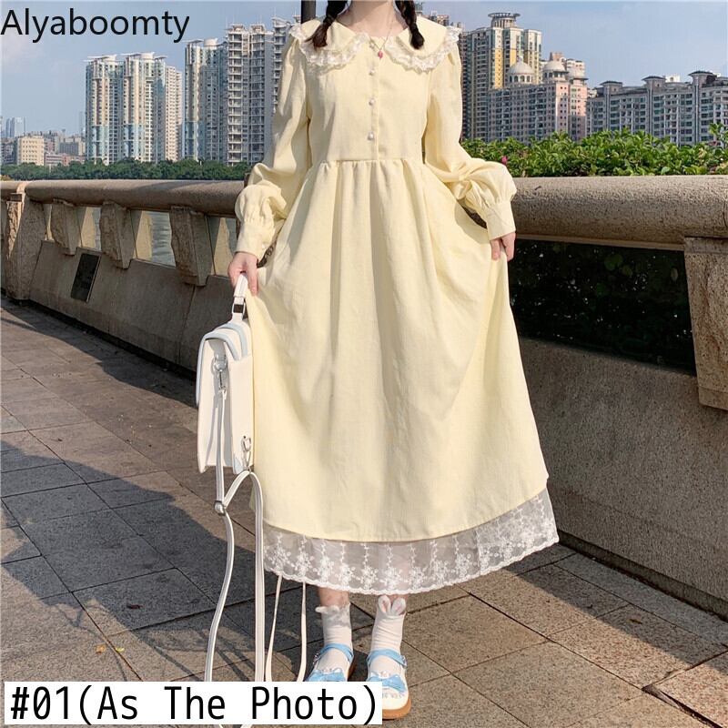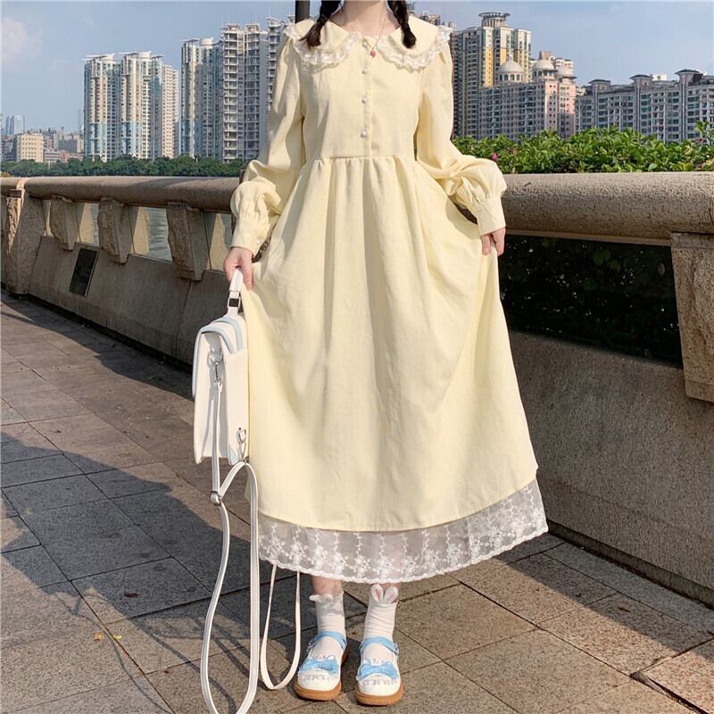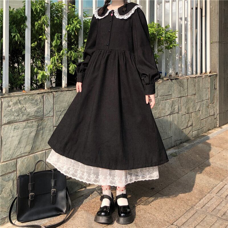 送料無料୨♥୧ 森オータムウィンターレディースロングドレス ピーターパンカラーベージュブラックレースフリル甘いコーデュロイ特大 AOS14228049038