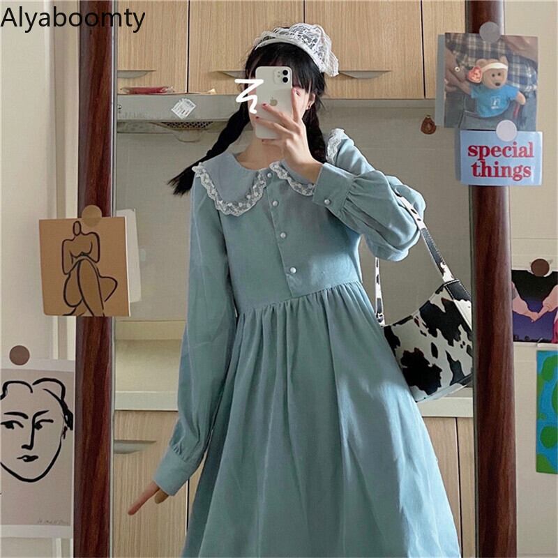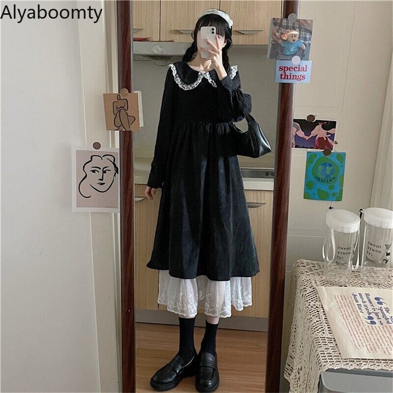 送料無料୨♥୧ オータムウィンターレディースソリッド ドレス カラーブラックブルールーズレースフリルロングコーデュロイ ラッフル 大人ガーリー スウィート キュート カジュアル かわいい 秋物 冬物 ソリッドカラー AOS28573339613