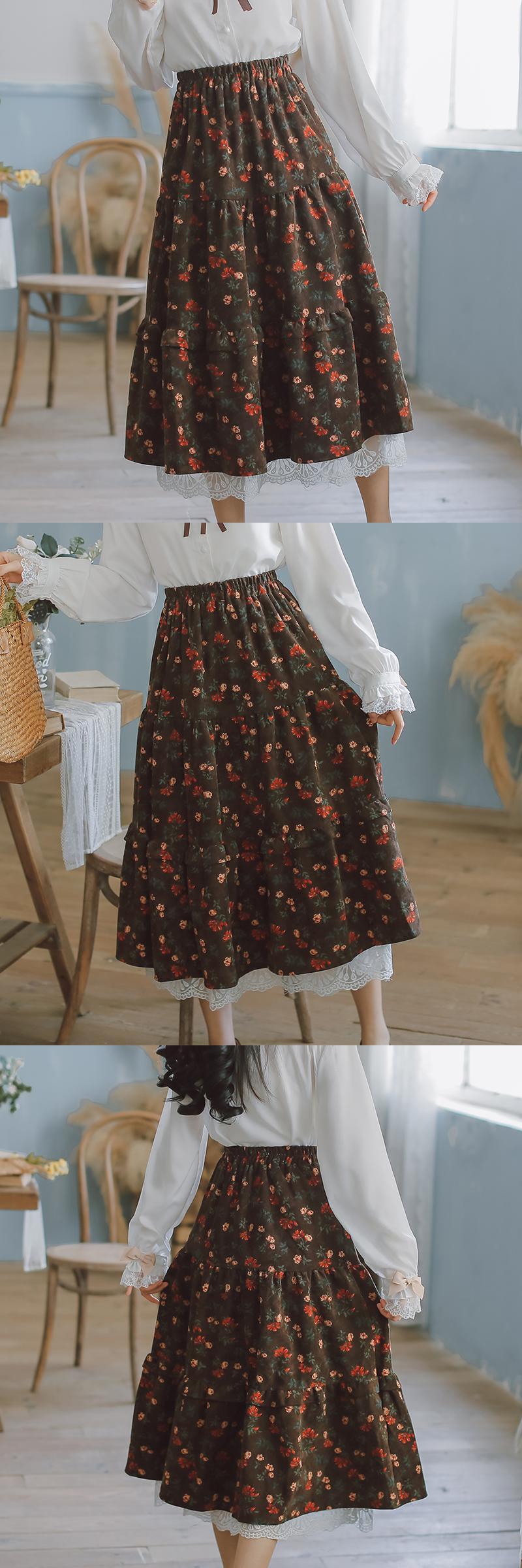送料無料୨♥୧ レディースミディスカート ウェストネイビーブルーブラウンフローラルレースフリルヴィンテージコーデュロイ ラッフル 大人ガーリー スウィート キュート カジュアル 花柄 ビンテージ AOS82642945678
