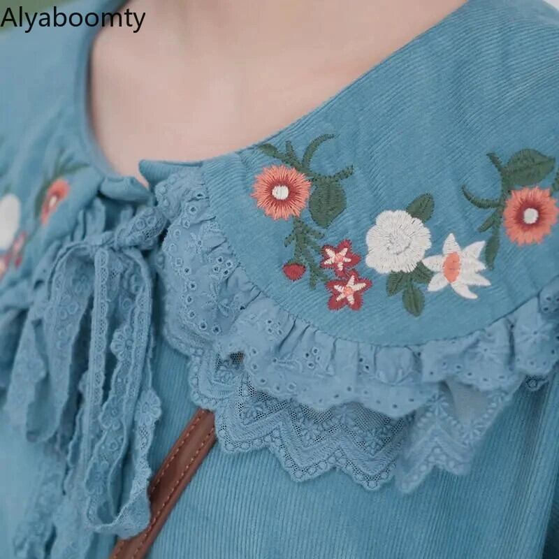送料無料୨♥୧ 森スプリングオータムレディースドレス ピーターパンカラーフローラル刺繍telレースフリル甘いブルー AOS21552372642