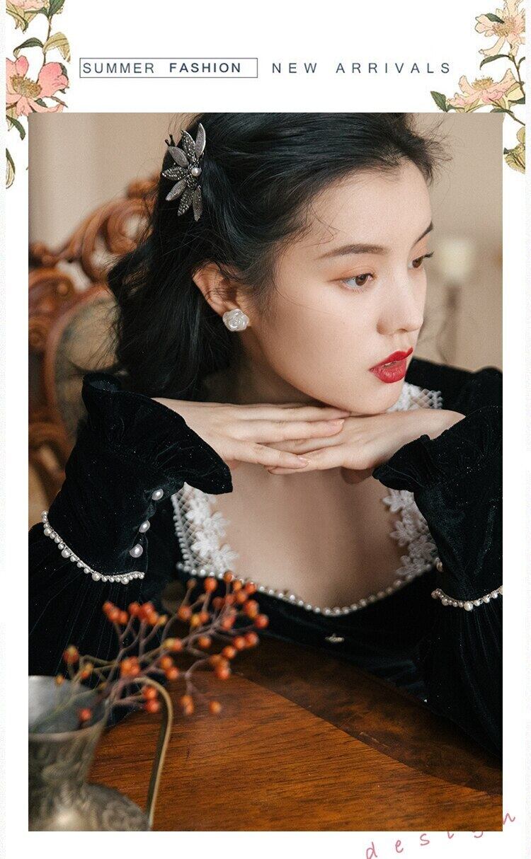 送料無料୨♥୧ スプリング秋レディースブラックミディAラインドレス 平方カラービーズレースベルベットゴージャスパーティーロング AOS44878991428
