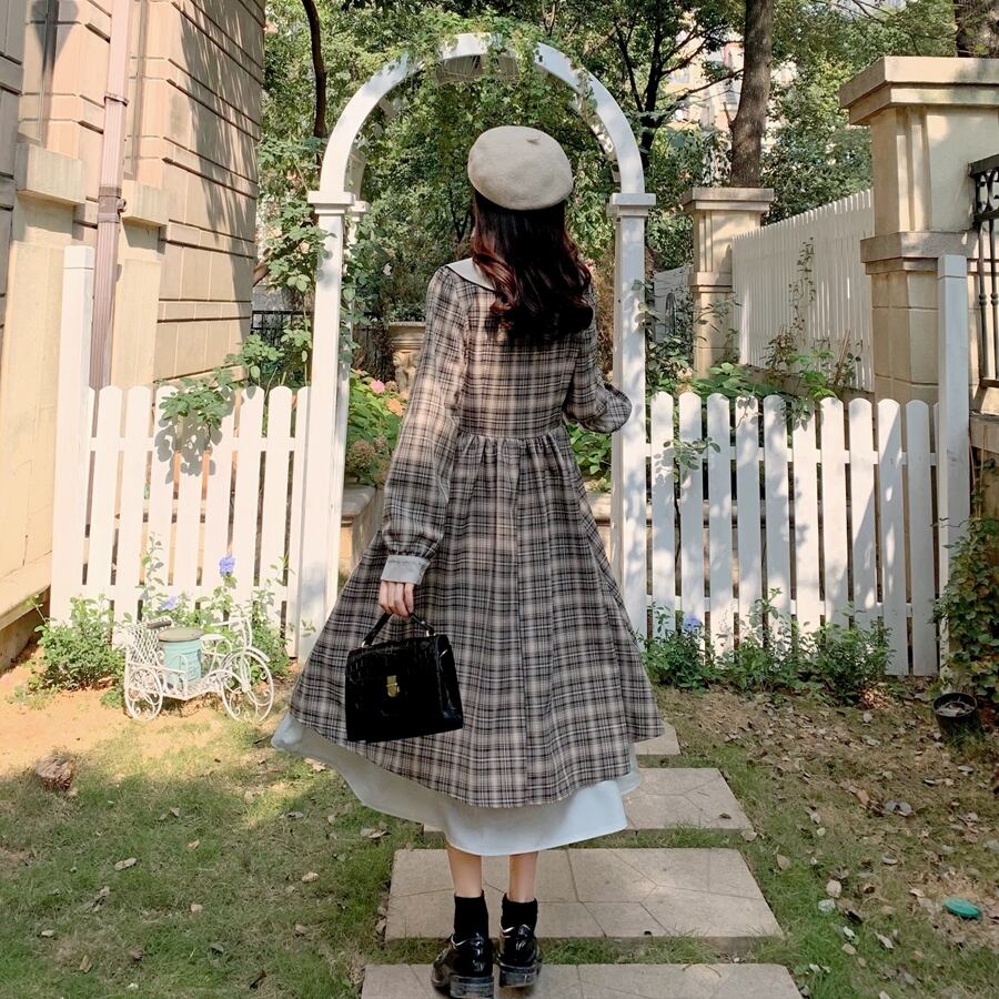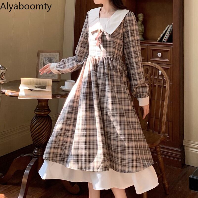送料無料୨♥୧ 森レディースロングシックドレス 若いスタイル格子柄リボン甘いスプリングオータムフリルヴィンテージ AOS6157251960