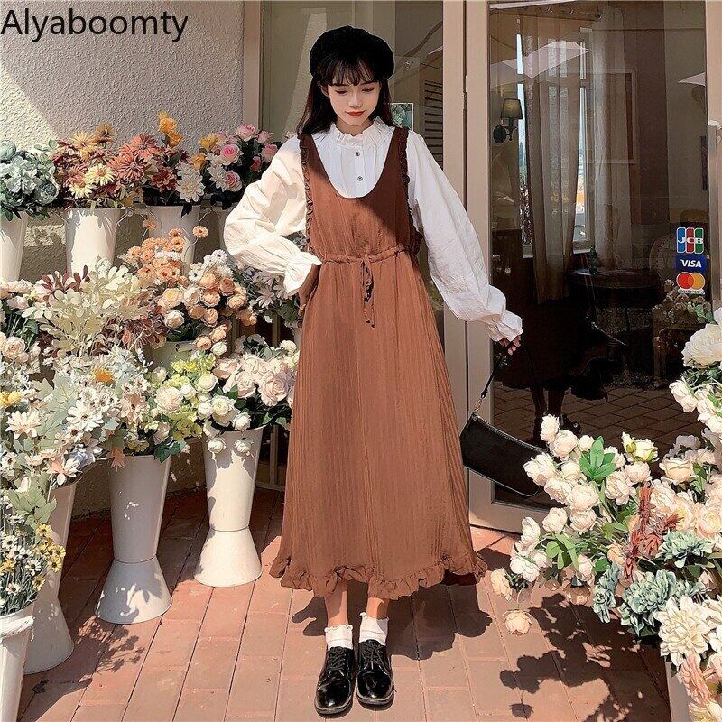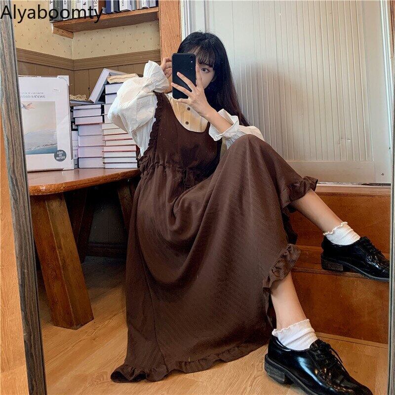 送料無料୨♥୧ プレッピースタイルスプリング秋レディースoロングドレス 首ブラウンルーズレースアップノースリーブ可愛いフリルミディ AOS93272392729