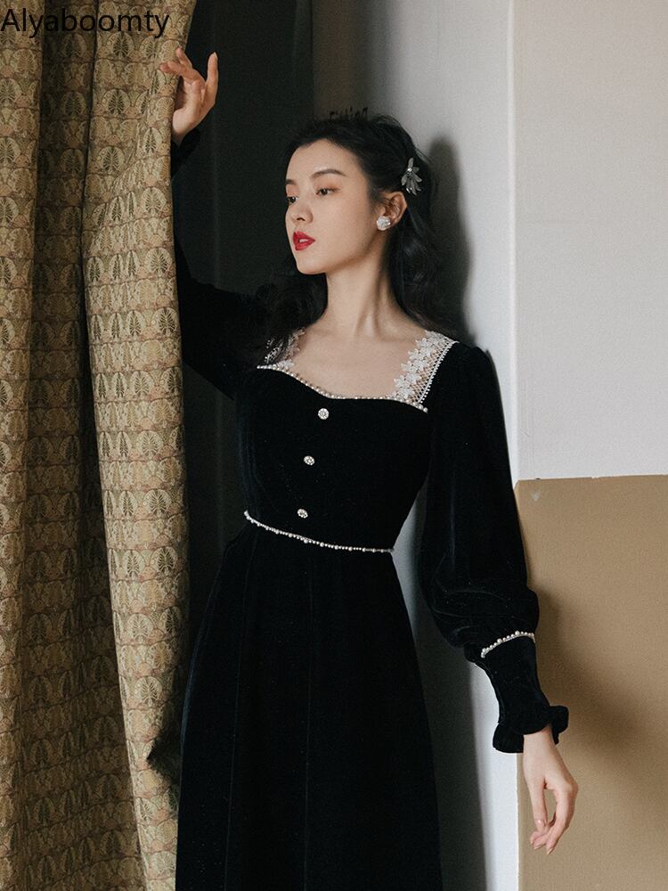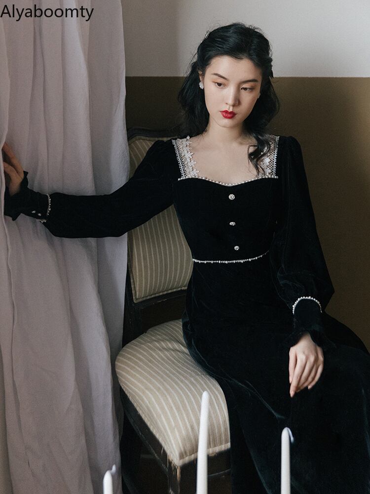 送料無料୨♥୧ スプリングレディースブラックミディAラインドレス カラーレースベルベットロング 春物 スクウェア AOS15347938805