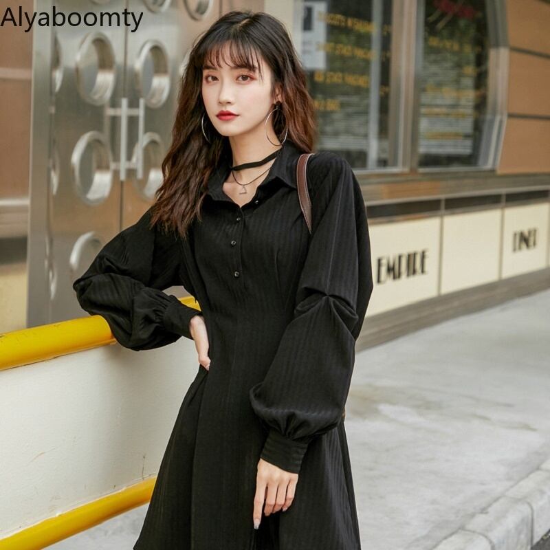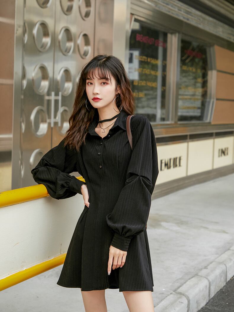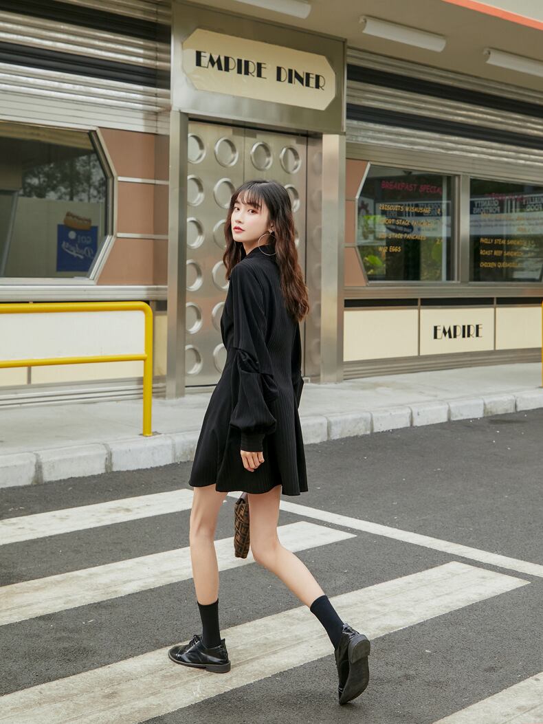 送料無料୨♥୧ ese原宿レディースブラックミニドレス 断るカラースリムシンプルゴシックストリートウェアランタンスリーブパンクスタイル AOS67071197311