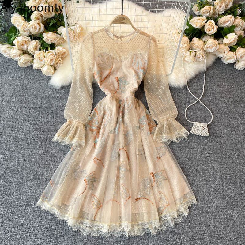 送料無料୨♥୧ スプリングオータムレディースドレス スタンドカラーカラー刺繍メッシュレース 春物 秋物 AOS42851911686
