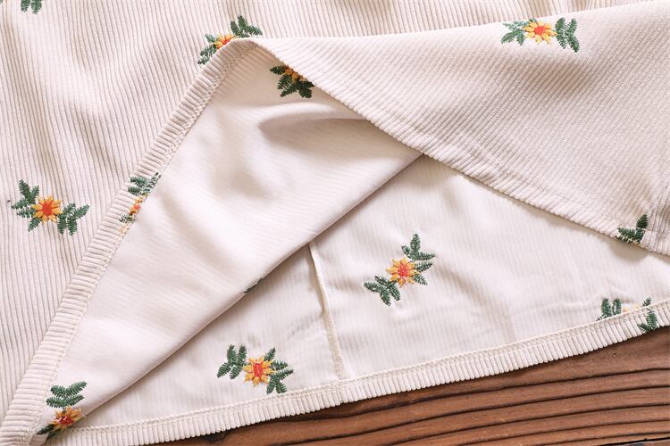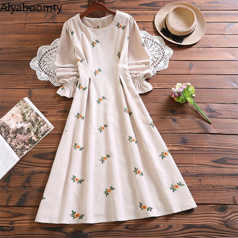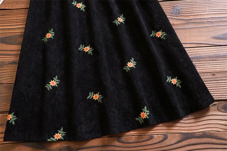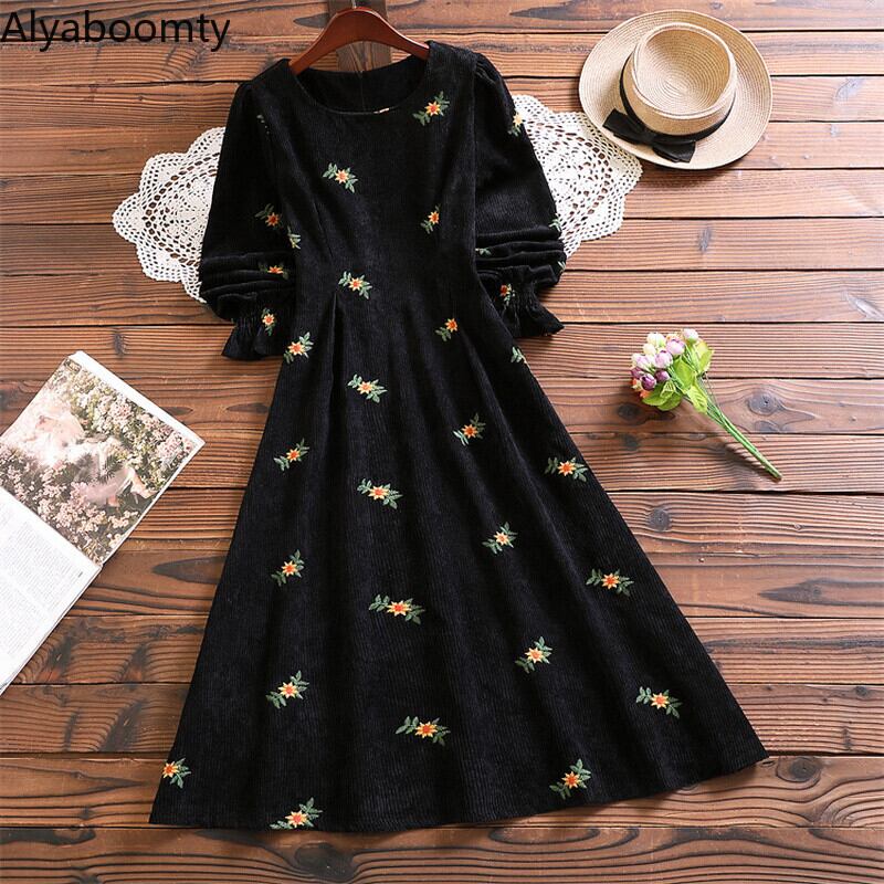 送料無料୨♥୧ 森oスプリングオータムレディースAラインロングドレス 首アプリコットブラックフローラル刺繍シックヴィンテージコーデュロイ AOS740011820