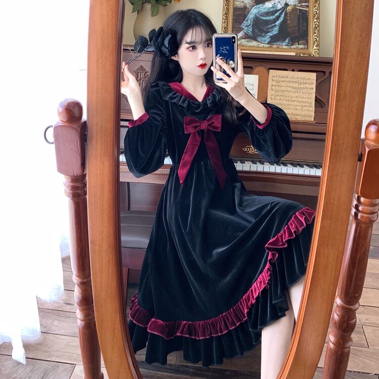 送料無料୨♥୧ eseロリータスタイルオータムウィンターレディースロングドレス Vネックリボンフリルサッシブラック可愛いベルベットクリスマスドレス ワンピース AOS57192893992